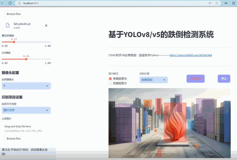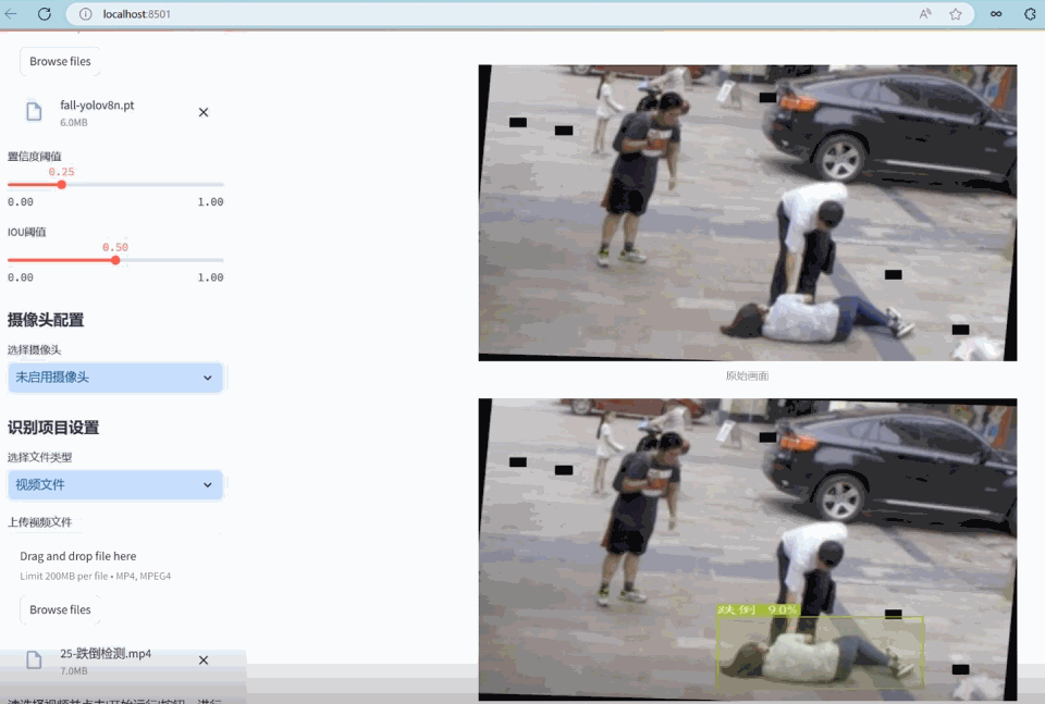 - Streamlit网页设计:采用Streamlit框架快速开发交互式网页应用,使得用户可以方便地进行图片、视频上传和实时摄像头的跌倒检测,同时支持切换不同的模型文件,满足不同检测需求。
