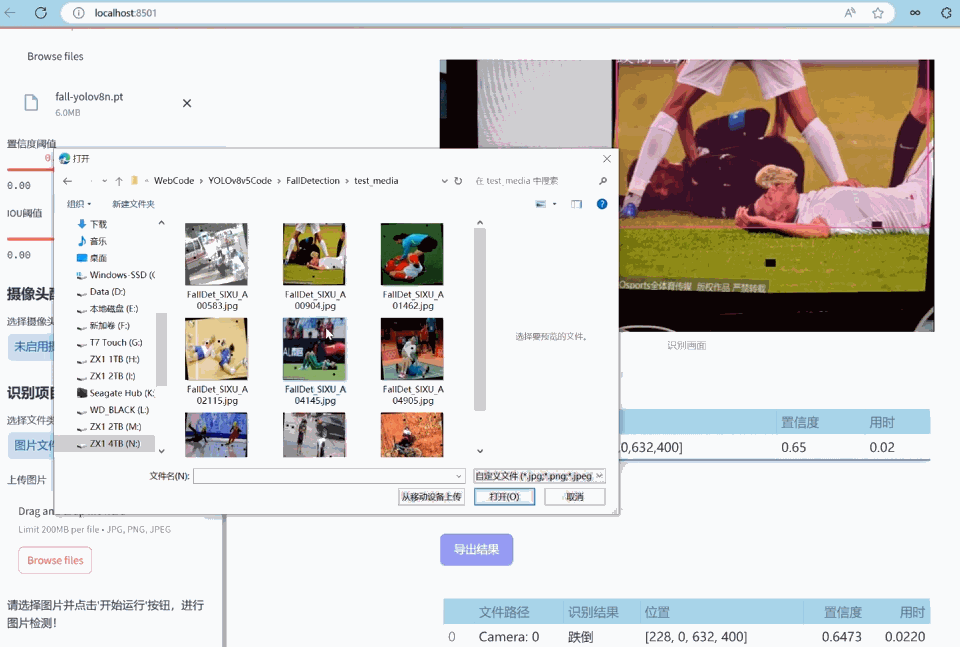 (2)选择图片检测:用户可以上传本地的图片文件到系统中进行跌倒检测。系统会分析上传的图片,识别出图片中的跌倒,并在界面上展示带有跌倒标签和置信度的检测结果,让用户能够清晰地了解到每个跌倒状态。