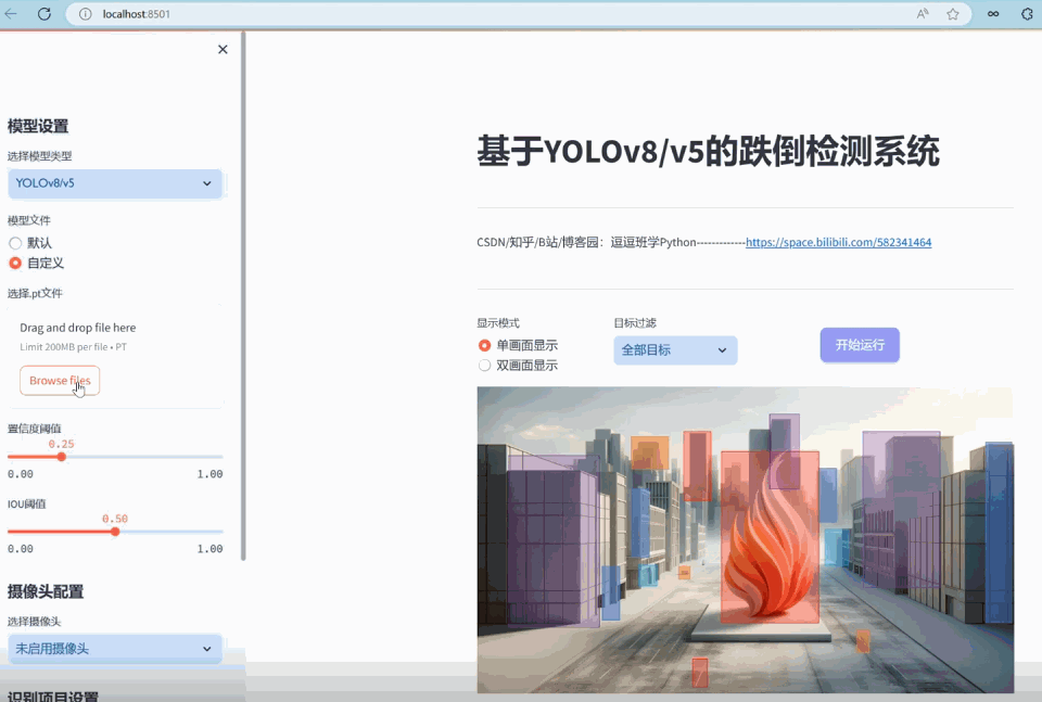 在UI侧边栏,用户可以通过setup_sidebar方法提供的界面选择模型类型、调整置信度阈值、IOU阈值,并选择输入源类型(摄像头、图片文件、视频文件)。此处,YOLOv8v5Detector类被实例化并加载了预训练的模型权重,准备进行跌倒检测。