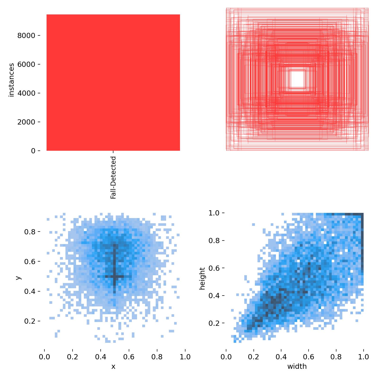 通过分析数据集的分布,我们得到了有关跌倒检测标注特征的有价值的见解。大多数跌倒事件的标注集中在图像的中心区域,这暗示了中心区域对于跌倒检测模型的特殊重要性。边界框的尺寸分布表明了模型需要能够检测到不同尺度的跌倒事件,从小尺寸(远处或部分身体跌倒)到大尺寸(近处或完整身体跌倒)。这些分析结果为我们后续的模型设计和训练策略提供了重要的指导。