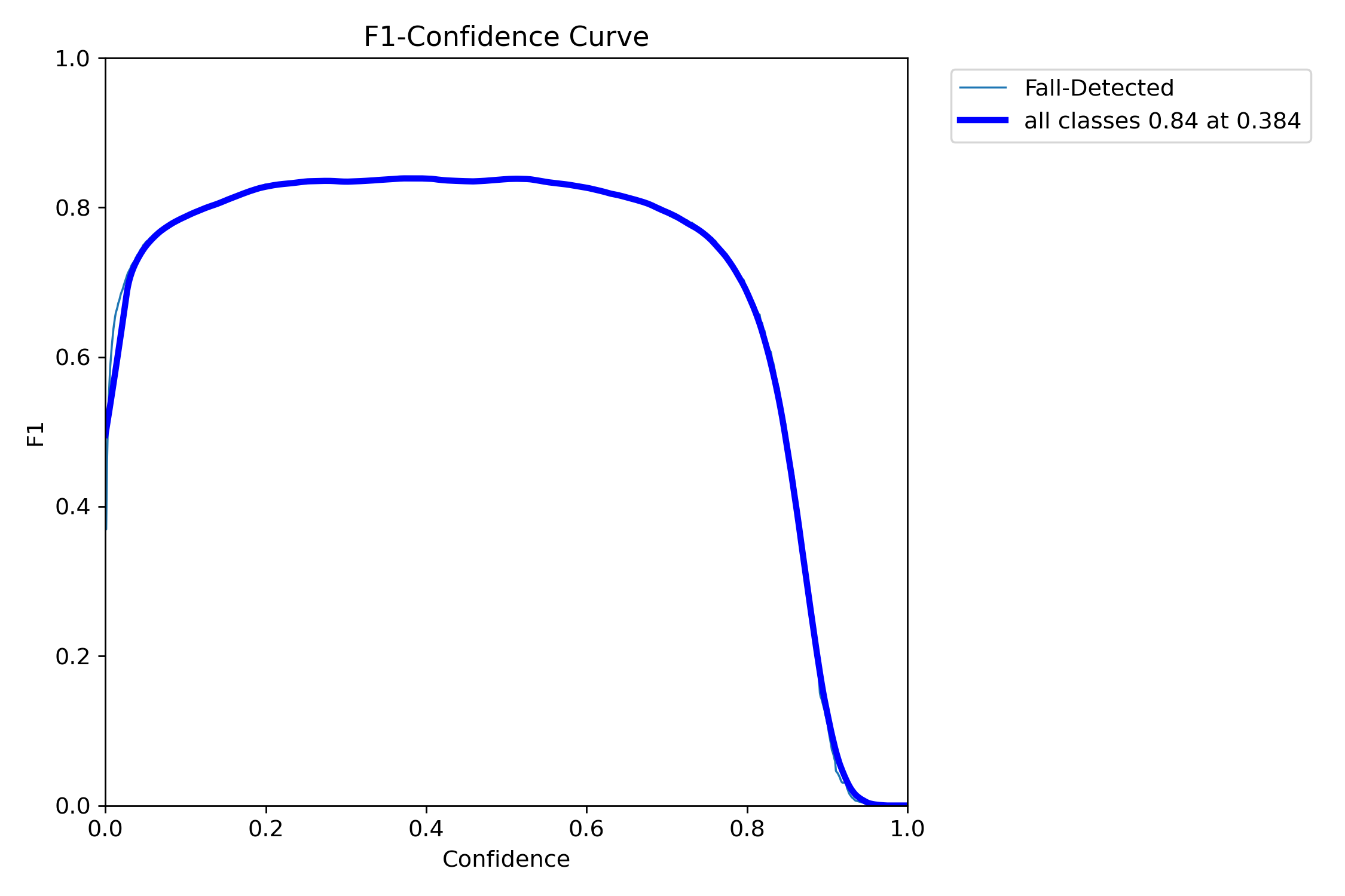 在跌倒检测的实际应用中,找到这样一个最优置信度阈值至关重要,因为它能确保既不会错过过多的实际跌倒事件(高召回率),也不会产生过多的误报(高精确度)。从图中可以看出,模型在接近0.384的置信度阈值时性能最佳,因此可以将该阈值作为跌倒检测模型在实际部署时的推荐设置。