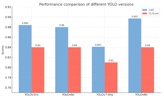 在F1分数方面,除了YOLOv7-tiny稍低,为0.81,其他三个模型都维持在0.84的水平。这表明在召回率和精确度的权衡上,YOLOv5nu、YOLOv6n和YOLOv8n能够达到较好的平衡,而YOLOv7-tiny可能在某些情况下存在漏检或误检的问题。