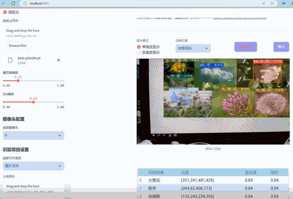 - 交互式网页界面:通过Streamlit实现一个直观且功能丰富的网页界面,用户可以轻松上传图像、视频或直接通过摄像头进行花卉检测,并查看检测结果。