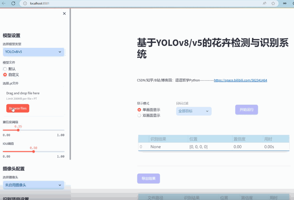 为了确保用户能够有效利用花卉检测与识别系统,用户界面的设计至关重要。界面需要直观易用,降低用户的操作难度。同时,功能布局应合理安排,使用户能够快速访问到实时监控、历史数据查询、模型切换等核心功能。 -