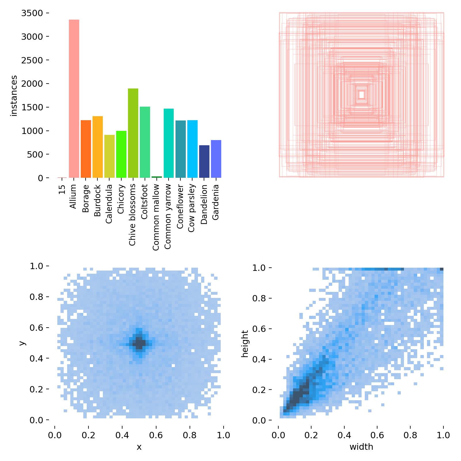 数据集的分布可视化告诉了我们更多故事。类别分布图显示了一个不平衡的现实,其中“Allium”类别的实例数遥遥领先,而“Gardenia”类别的样本数量最少。这种不平衡要求我们在模型训练时采用策略,如类别权重调整或过/欠采样方法,以防止模型偏向那些更常见的类别。对象尺寸和位置的分布密度图揭示了图像中对象的集中趋势以及多样化的尺寸比例。这种分布特征启示我们需要训练一个对图像中心和边缘区域同样敏感的模型,并且能够识别不同大小的花卉。边界框的重叠程度表明了存在一定数量的遮挡情况,这对检测算法的准确性是一个考验。