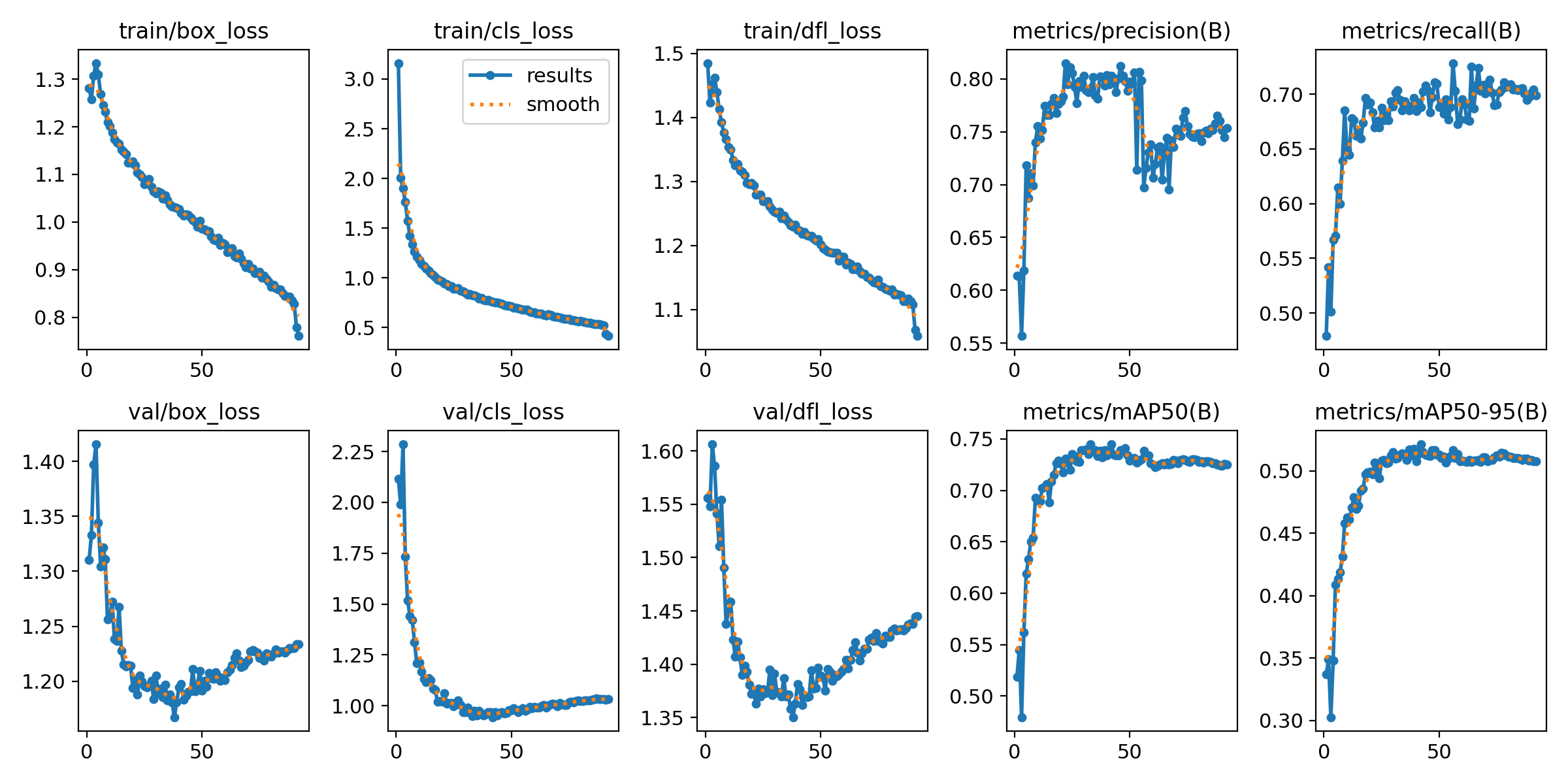 平均精度均值(mean Average Precision, mAP)为0.745 mAP@0.5,这是一个综合所有类别的单一性能指标。在IOU阈值设定为0.5的条件下,mAP提供了模型整体性能的评估。在我们的情况下,0.745的mAP指标表明模型具有良好的整体性能,尽管在某些特定类别上可能仍有改进的空间。