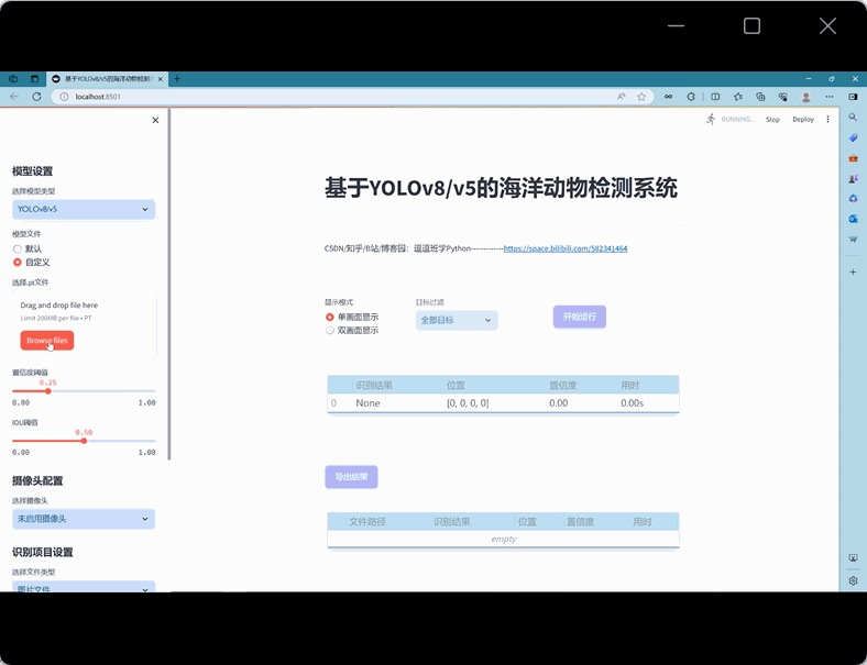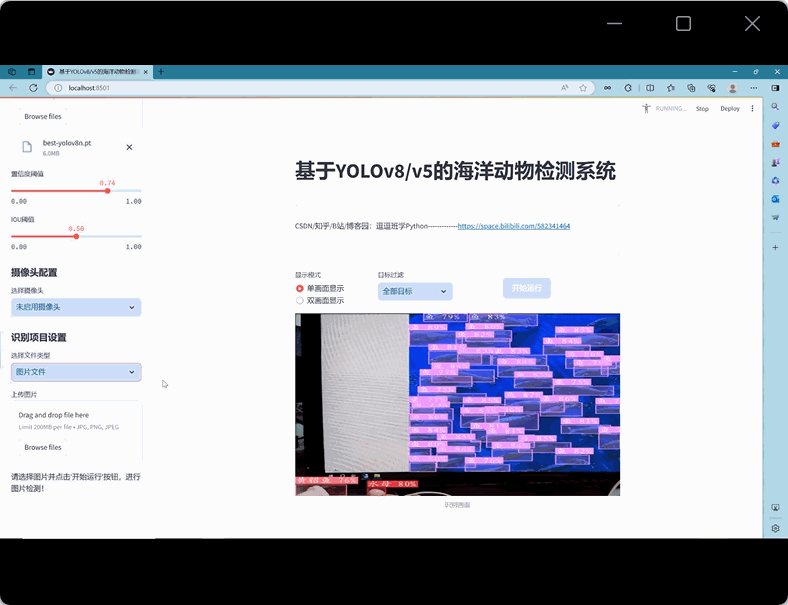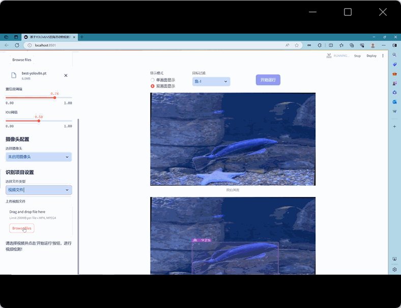 通过Streamlit构建交互式Web应用,支持图片、视频及实时摄像头输入的海洋动物检测。用户可以轻松切换不同的预训练模型,实时查看检测结果。 -
