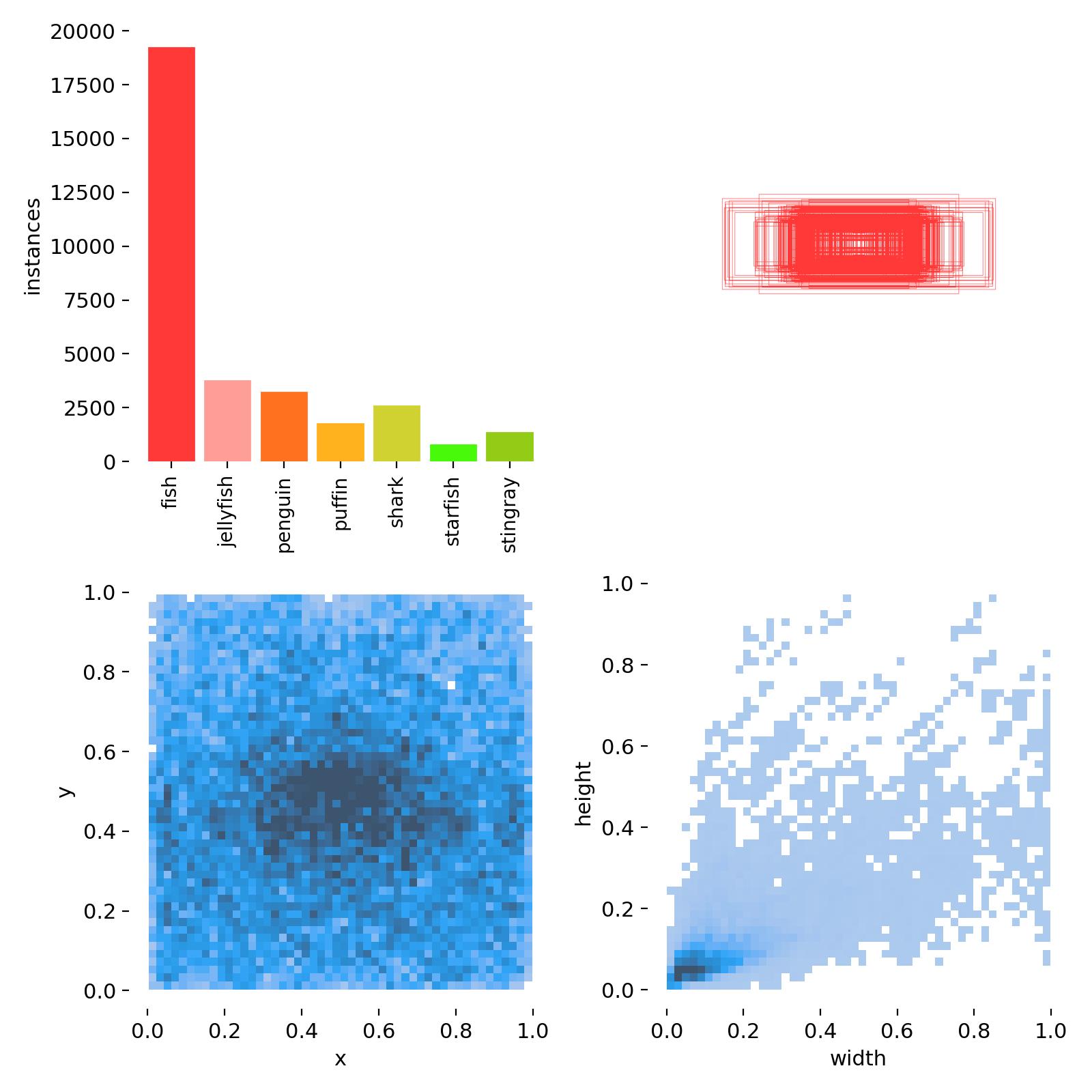 我们进一步分析了数据集的分布情况,通过对类别实例的统计和边界框分布的可视化,我们可以获得有关数据集构成的深入理解。统计图显示,数据集中“鱼类”实例数量最多,远超其他类别,这可能反映了海洋生态系统中的实际物种分布。然而,我们也注意到,“水母”、“企鹅”和“海豚”等类别的实例较少,这意味着模型可能需要额外的技术,如过采样或权重调整,来避免对于频繁出现类别的过度拟合。