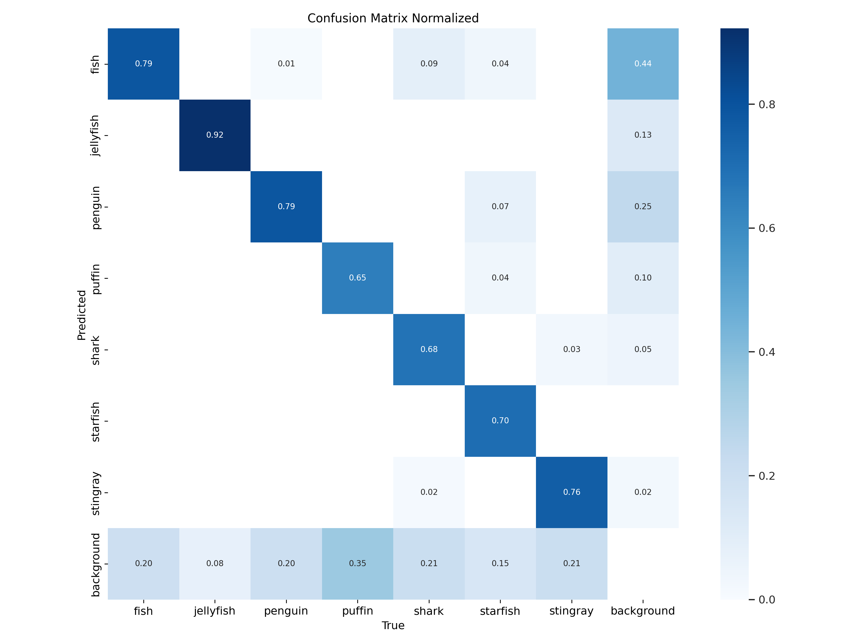 首先,观察矩阵中沿主对角线的数值,这些数值代表了每个类别被正确分类的比例。例如,‘fish’类别的0.79表示79%的‘fish’被正确识别,这是一个相对较高的识别率,而‘jellyfish’类别的0.92则表示有92%的‘jellyfish’被准确识别,这显示出模型对于这个类别的识别表现极佳。类似地,‘penguin’和‘stingray’的识别率也较高,分别为0.79和0.76,说明模型对这些类别具有良好的分类能力。