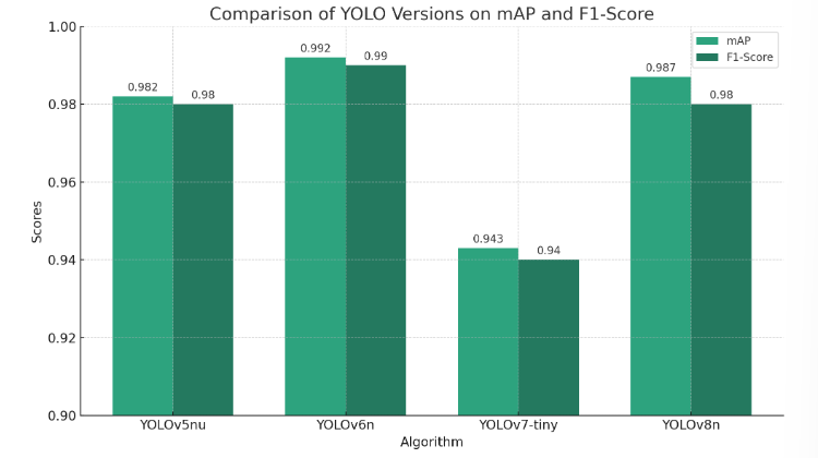 从图中我们可以看出,YOLOv6n在这次的比较中表现最为出色,其mAP和F1-Score均为最高值0.992和0.99。这表明在该数据集上,YOLOv6n对海洋动物的检测不仅精确度高,而且在各类别间的平衡性方面也非常优秀。YOLOv5nu和YOLOv8n的表现非常接近,它们的mAP和F1-Score分别为0.982与0.987、0.98与0.98,说明这两个版本的模型在此数据集上也有着不错的性能。而YOLOv7-tiny的表现稍弱,mAP和F1-Score分别为0.943和0.94,这可能是因为“tiny”版本的模型为了减少计算复杂度和提升速度,牺牲了一定的准确性。