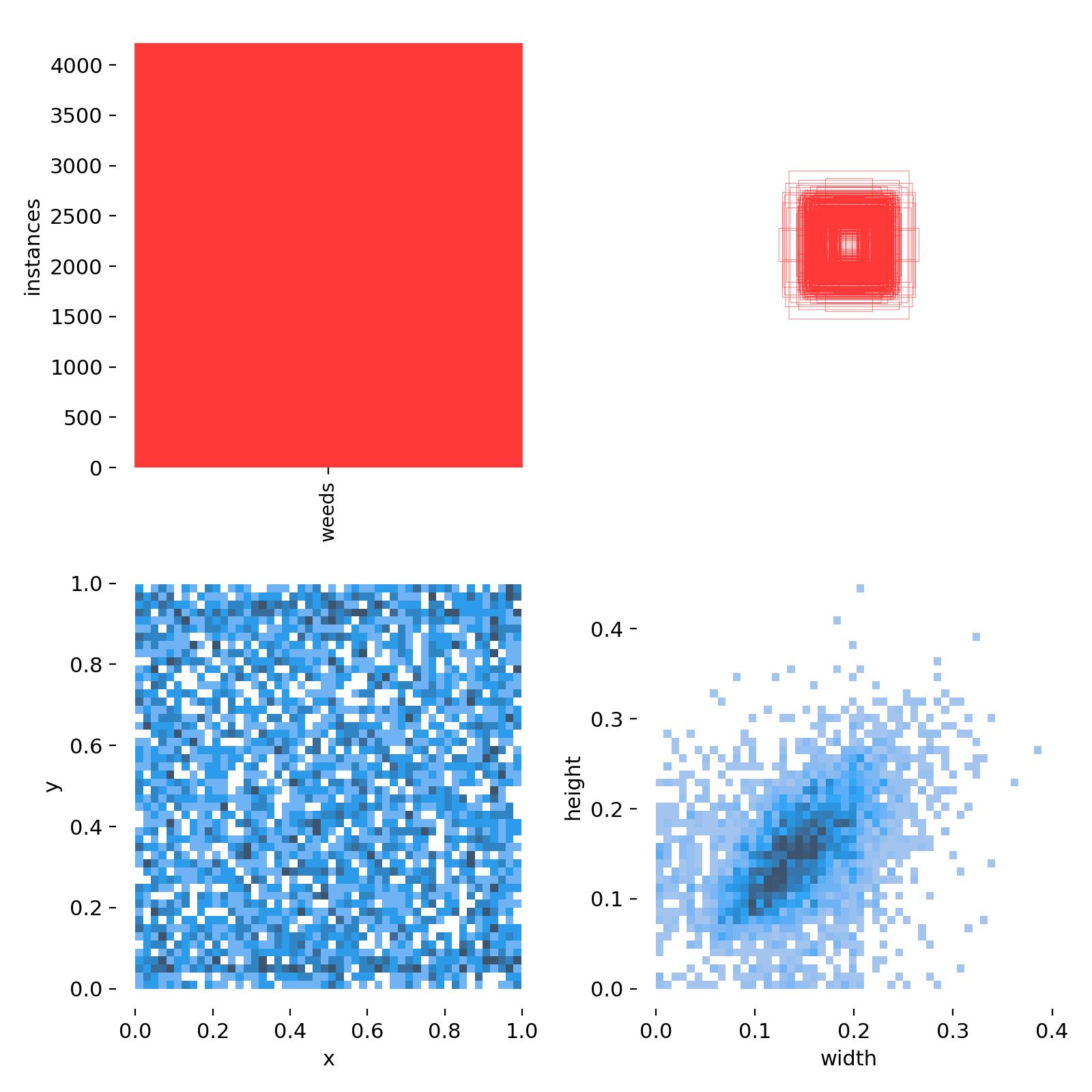 分析数据集中的标注分布,我们发现杂草标注在图像中的分布相对均匀,没有特定的集中趋势,这意味着杂草可能出现在图像中的任何位置。这样的分布为模型训练提供了挑战,因为模型需要能够在整个图像区域内识别杂草。另一方面,边界框尺寸分布表明,绝大多数杂草标注为图像中的小尺寸对象,这提示我们在模型设计时需要特别关注对小目标的检测能力。