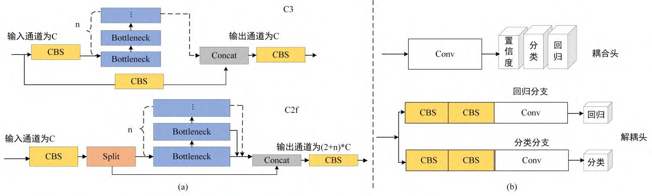 Ultralytics公司于2023年初发布YOLOv8模型,相较于2020年发布的YOLOv5模型,YOLOv8模型将C3模块(CSP Bottleneck with 3 convolutions)改进成C2f模块(CSP Bottleneck with 2 convolutions),C3模块和C2f模块结构如下图(a)所示。图中CBS(Convolutions Bn SiLU)模块由基础卷积(Conv)、批量归一化(BN)和激活函数(SiLU)组成。C2f模块采用了多分支流设计,为模型提供了更丰富的梯度信息,强化了模型的特征提取能力,提高网络的学习效率。