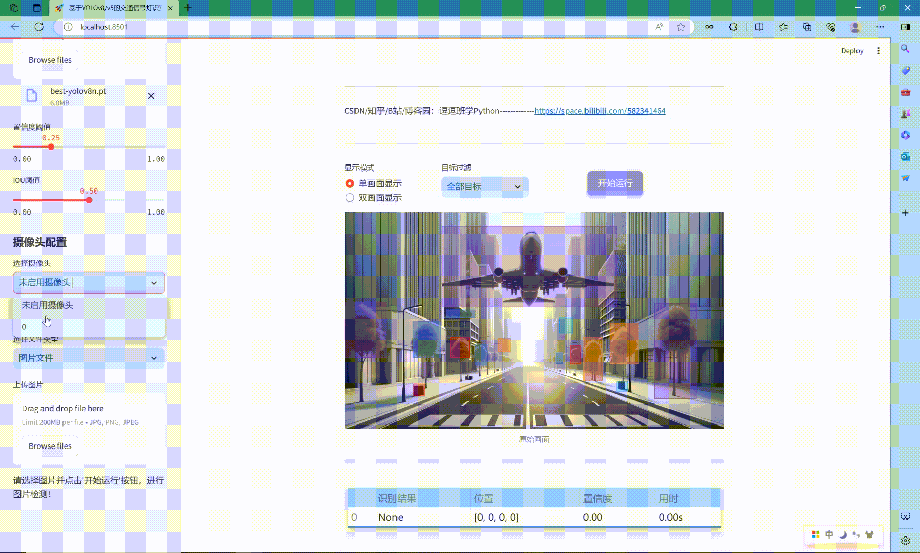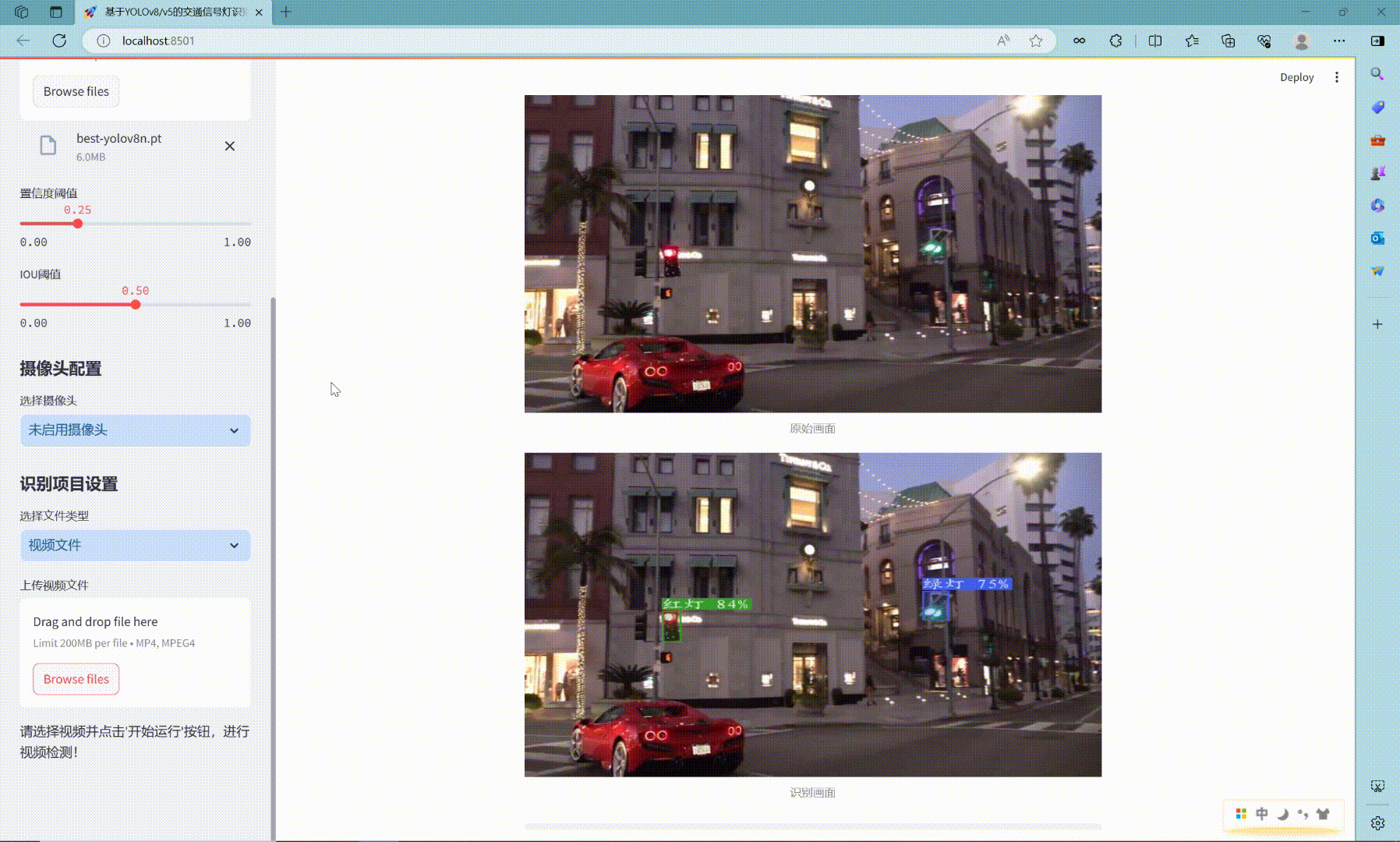 - Streamlit Web界面:采用Streamlit构建用户交互界面,提供图片、视频和实时摄像头的交通信号灯检测功能。Streamlit的简洁高效使得快速开发交互式Web应用成为可能。
