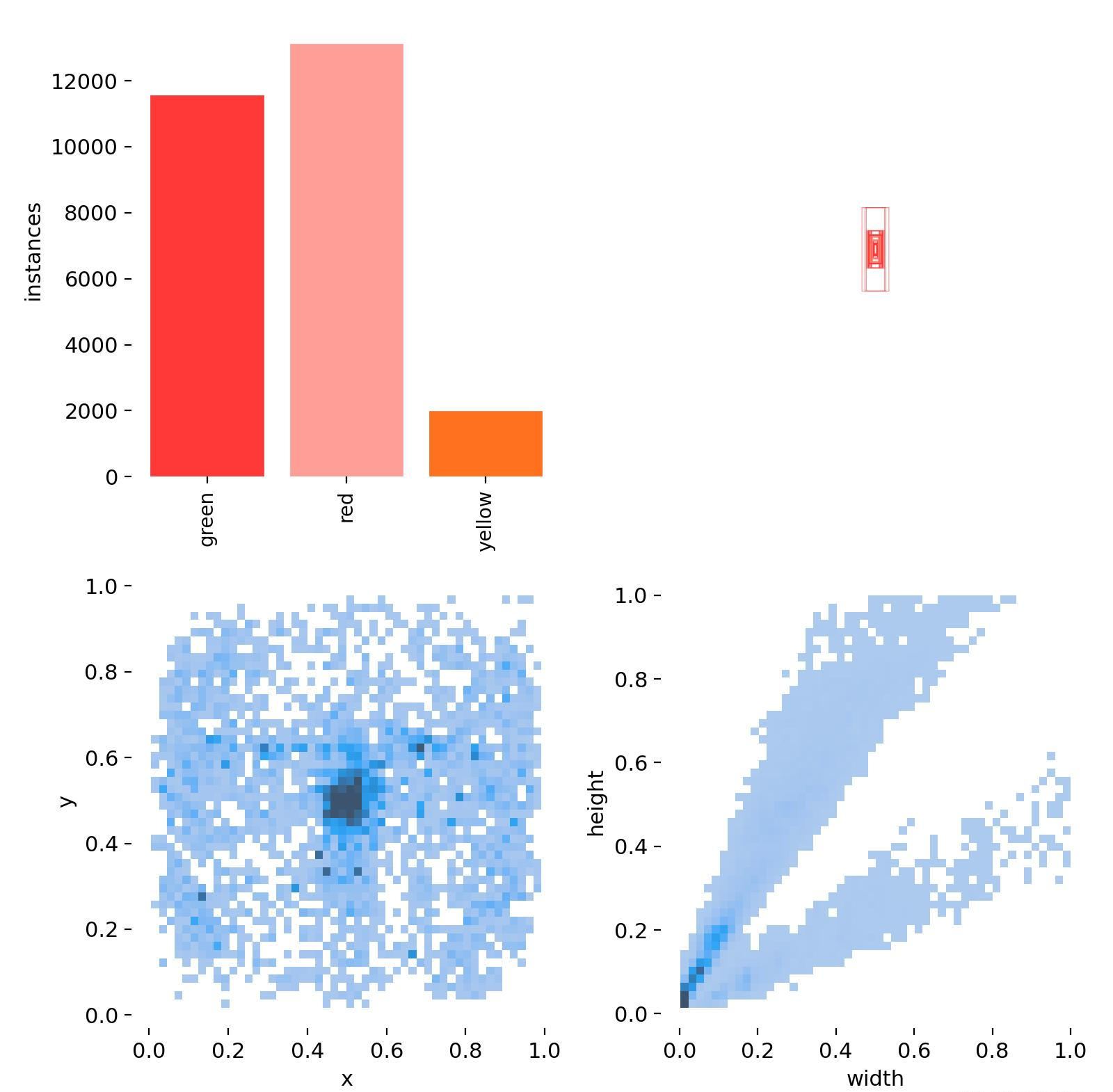 边界框大小的分布揭示了交通信号灯在图像中的尺寸多样性。从图中可见,宽度和高度分布较为集中,表明大多数交通信号灯具有相对一致的比例。这对于训练深度学习模型来说是一个积极信号,因为模型可以学习到一致的特征,从而更好地识别出不同尺寸的信号灯。尽管如此,我们也注意到边界框宽高比的分布存在一定程度的分散,这表明在实际场景中,信号灯的视觉呈现可能因距离和角度的不同而有所变化。这样的多样性要求我们的检测系统不仅要能够识别标准的交通信号灯图像,还要能够处理不同尺寸和角度的变化,确保系统的鲁棒性和准确性。