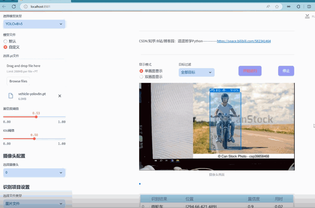 我们通过Streamlit框架构建了一个简洁直观的用户界面。在界面上,用户可以轻松上传图片或视频文件,或者选择摄像头进行实时监控。通过侧边栏(sidebar),用户可以调整模型参数,如置信度阈值和IOU阈值,以及选择不同的显示模式和摄像头。系统会实时显示检测结果和处理进度,提供友好的用户体验。