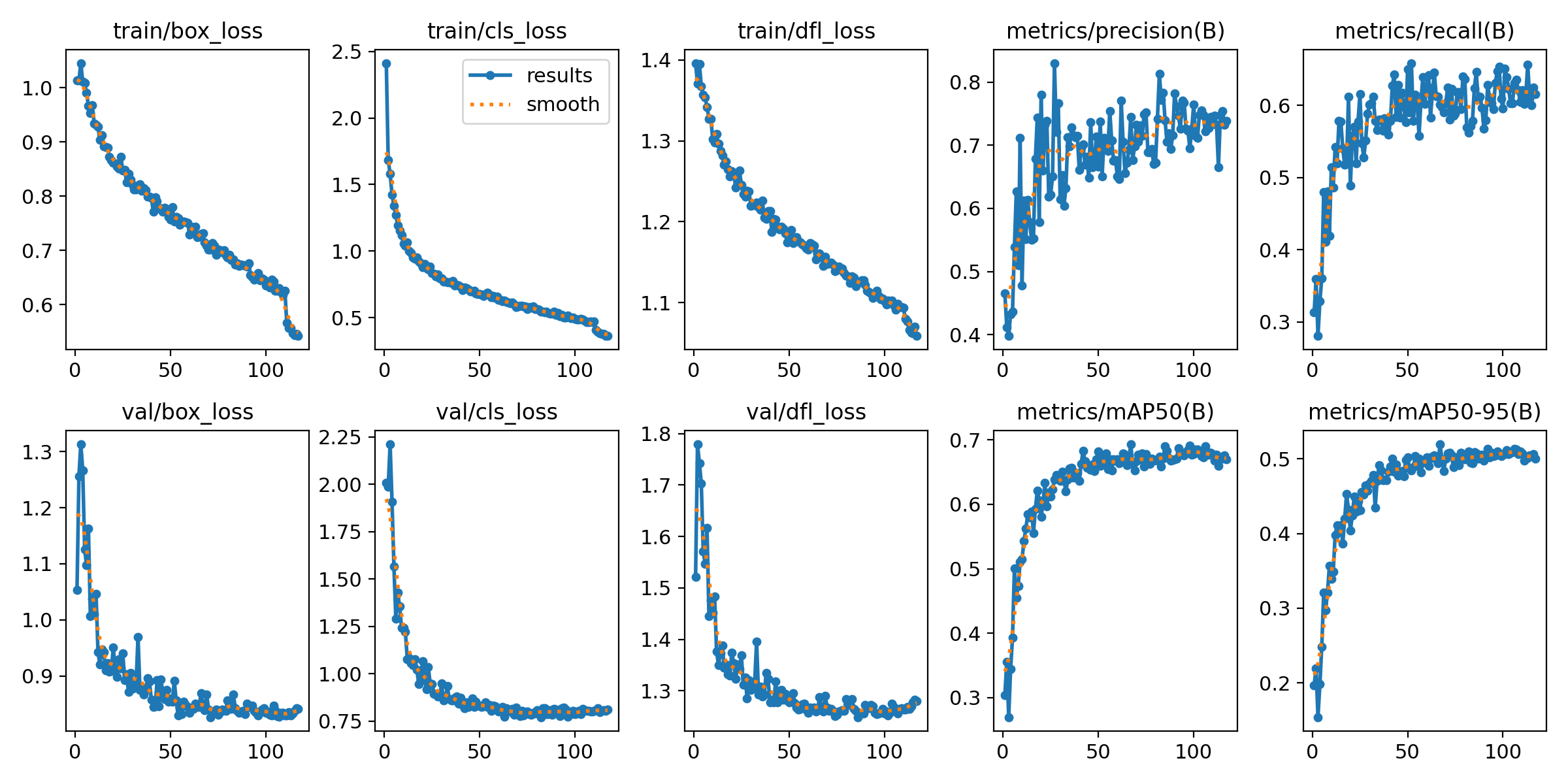 最终,模型的平均精度(mAP)是衡量模型整体性能的重要指标。在metrics/mAP@0.5(使用IoU阈值为0.5时的mAP)和metrics/mAP@0.5-0.95(在IoU从0.5到0.95的范围内计算的mAP)中,我们看到随着训练进程的进行,mAP值稳步提升,最终在较高水平稳定下来。这表明模型在各种重叠阈值下都能可靠地检测目标,而且对目标位置的精确度有着较高的评估准确性。