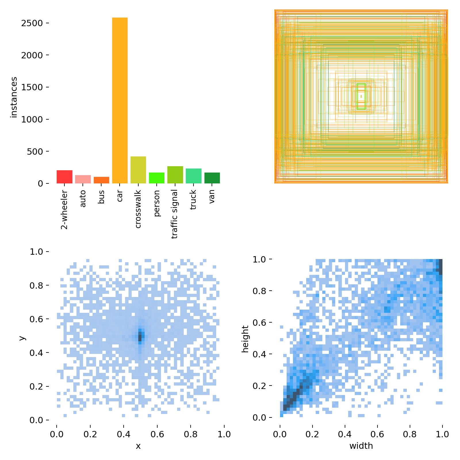 通过对目标位置和尺寸分布的热力图分析,我们观察到大多数目标位于图像的中央区域,而且通常呈现较小的尺寸。这种分布对于设计输入层和选择合适的锚框尺寸至关重要。热力图的这一洞察也启示我们在数据增强时要特别考虑到边缘和角落的目标,以增强模型对不同位置目标的检测能力。