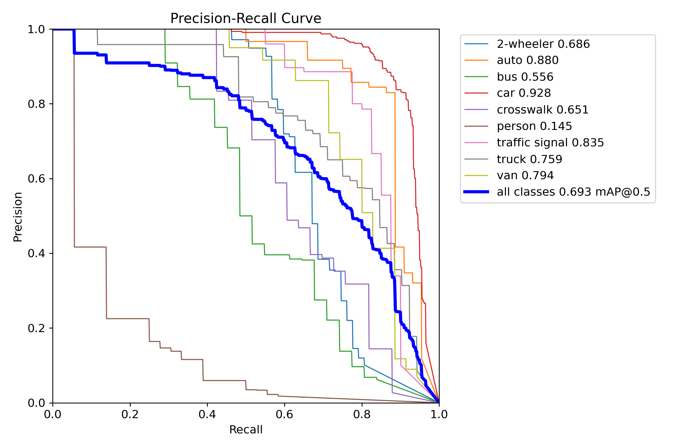 '2-wheeler' 类别的AP为0.686,虽然没有达到车辆类别的高AP,但仍表明模型对这一较为具体的类别有着相对较好的识别能力。在所有类别上,模型达到了0.693的mAP@0.5,这是一个中等水平的表现,说明模型在整体上具备较为均衡的检测能力,能够在大多数情况下准确地识别和分类目标。