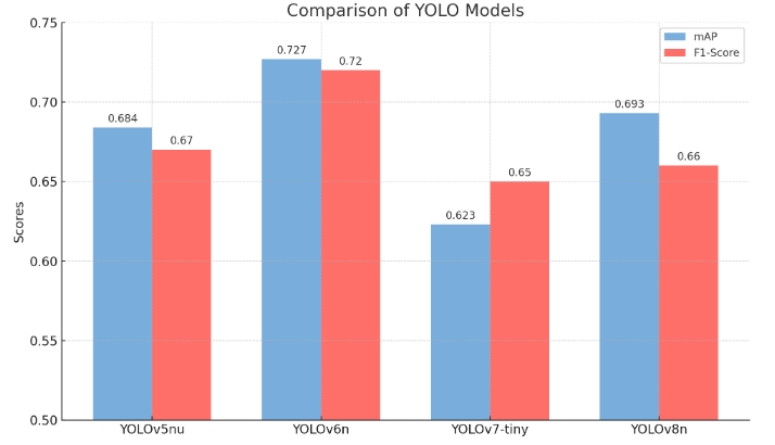 在F1-Score上,YOLOv6n以0.72的得分同样位居榜首,这显示了该模型在维持较高召回率的同时,也保持了较高的精确率,这是一个平衡的结果,表明YOLOv6n在减少误检和遗漏方面做得较好。YOLOv7-tiny以0.65的F1-Score位于较低位置,这可能是因为“tiny”版本在简化网络以降低计算复杂度的同时,牺牲了部分识别能力,尤其可能在减少假阳性和提高召回率方面存在不足。YOLOv8n的F1-Score为0.66,略低于YOLOv5nu,这表明在特定任务中,模型的新颖性并不总是等同于更优性能,早期版本可能因为经过了更多的测试和优化,在实际应用中展现出了坚实的性能。