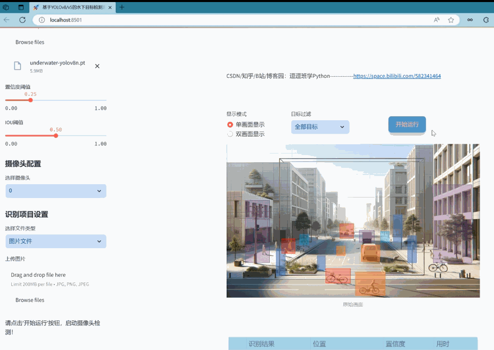 网页界面设计:利用Streamlit框架开发了一个直观友好的网页界面,支持图片、视频和实时摄像头的目标检测功能,用户可以轻松切换不同的模型文件,实现定制化的检测需求。界面美化采用CSS技术,提升了用户交互体验。