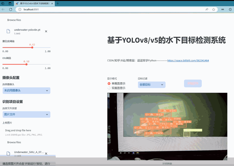 本文通过深入研究并实践了基于YOLOv8/v7/v6/v5的深度学习模型在水下目标检测领域的应用,成功开发了一个集成这些先进算法的水下目标检测系统。通过对YOLO系列模型的多个版本进行详细的比较和细致的优化,本研究不仅显著提高了水下目标检测的准确性和实时性,还借助Streamlit构建了一个直观、高效且用户友好的Web应用,从而在水下探测和研究等实际应用场景中展现出巨大的潜力。