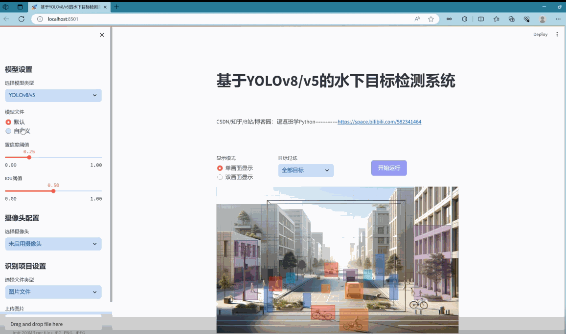 基于Streamlit的网页界面设计是本系统的用户交互窗口,其直观性和功能性对于用户体验至关重要。界面需要简洁易用,同时提供包括图片、视频、实时摄像头检测以及模型切换等核心功能。 -