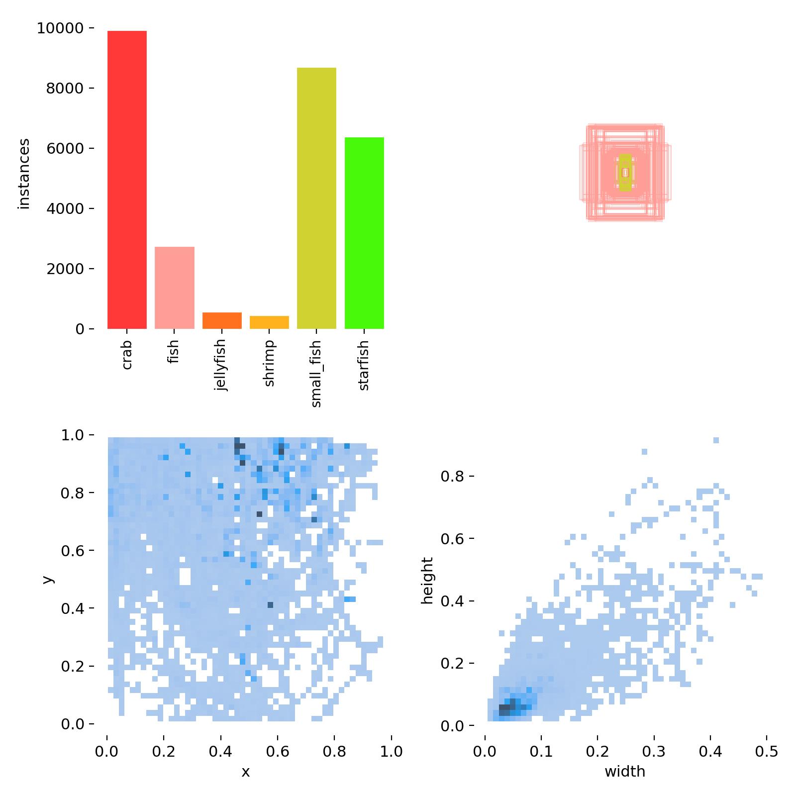 图像的类别分布反映了数据集的一项关键特性——多样性。数据集包含六种不同类别的水下生物,包括螃蟹、鱼、水母、虾、小鱼和海星。螃蟹和鱼类的样本量显著多于其他类别,这可能导致模型在识别这些更常见类别时表现更优。为了解决这种类别不平衡的问题,可能需要对少数类别进行过采样或调整模型训练过程中的类别权重,以避免模型过度倾向于多数类别,保证在所有类别上都能达到高准确率。