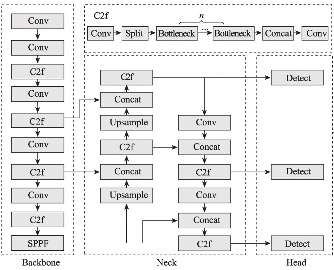 Ultralytics公司于2023年初发布YOLOv8模型,相较于2020年发布的YOLOv5模型, YOLOv8模型将C3模块(CSP Bottleneck with 3 convolutions)改进成C2f模块(CSP Bottleneck with 2 convolutions)。图中CBS(Convolutions Bn SiLU)模块由基础卷积(Conv)、批量归一化(BN)和激活函数(SiLU)组成。C2f模块采用了多分支流设计,为模型提供了更丰富的梯度信息,强化了模型的特征提取能力,提高网络的学习效率。