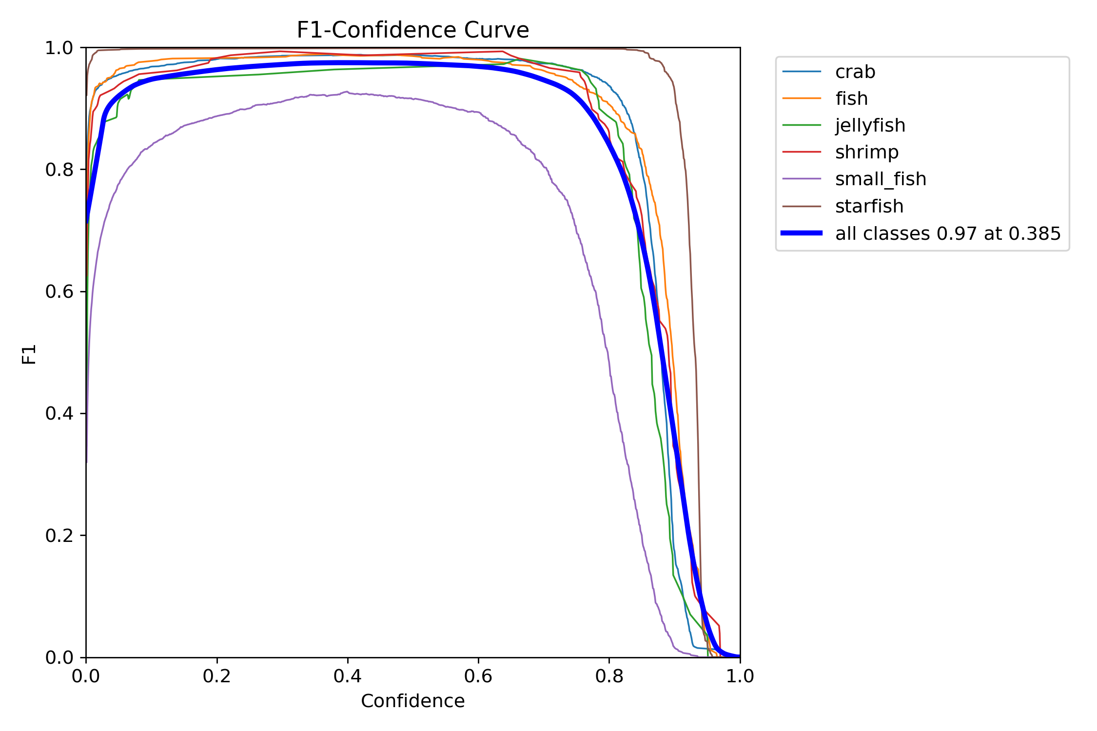 观察整体趋势,所有类别的F1-Score在置信度阈值约为0.385时达到了峰值,这一点在曲线图中用蓝色标记表示,整体F1-Score达到了0.97的高分,说明模型在这一阈值下对于检测任务达到了良好的精确度与召回率的平衡。