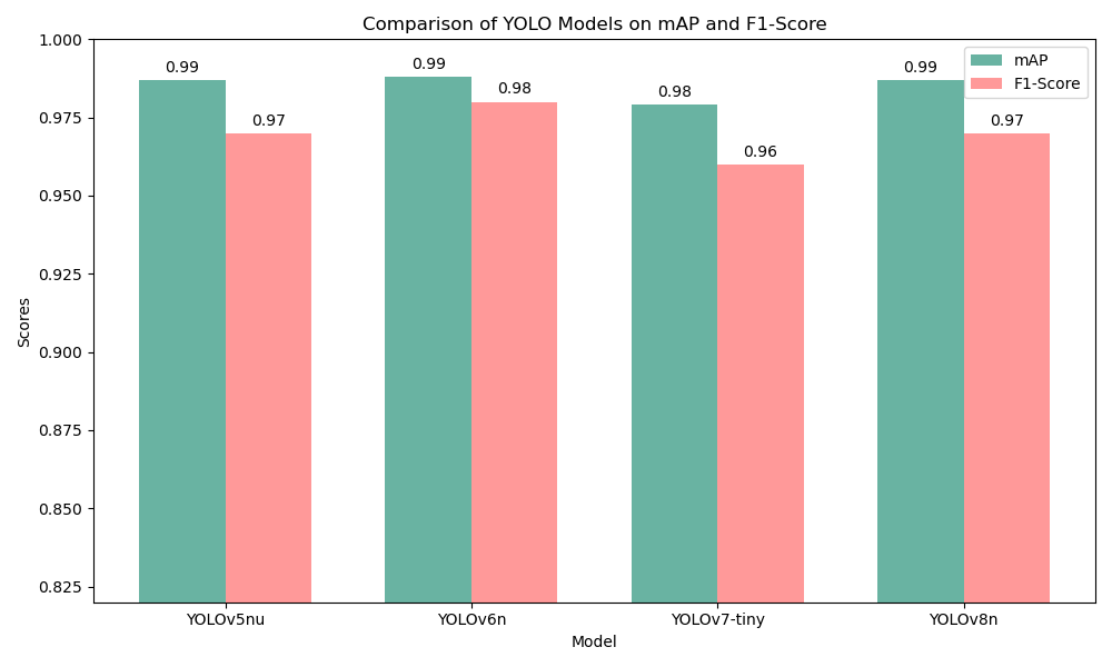 在我们的水下目标检测任务中,通过对比YOLOv5nu、YOLOv6n、YOLOv7-tiny、YOLOv8n四个模型的mAP和F1-Score,我们旨在评估它们在精度和平衡性能上的表现。实验结果显示,YOLOv6n在mAP上略占优势,得分为0.988,而在F1-Score上,YOLOv6n和YOLOv8n均达到了0.97的较高分数,这意味着这两个模型在精确性和召回率之间取得了良好的平衡。