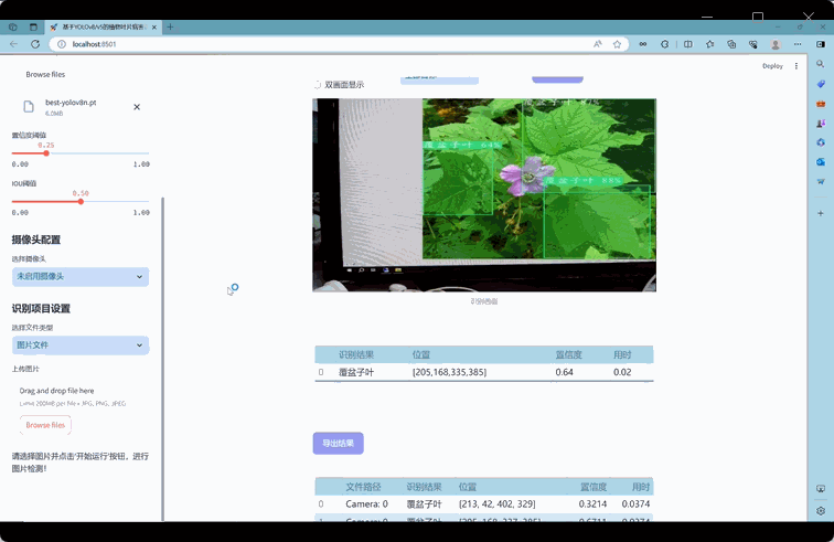 为了让用户能够更灵活地调整检测结果,我们实现了可以动态调整的置信度阈值和IOU阈值设置,以及将检测结果动态显示在页面表格上的设计。用户还可以通过点击按钮,将表格结果输出到CSV文件,或将标记过的图片、视频及摄像头画面的检测结果导出为AVI图像文件,便于保存和进一步分析。通过这些精心设计的功能,我们的Web应用不仅提高了植物叶片病害检测的效率和准确性,也极大地优化了用户体验。我们期待未来能够进一步优化该应用,引入更多创新功能,以更好地服务于医疗健康领域的需求。