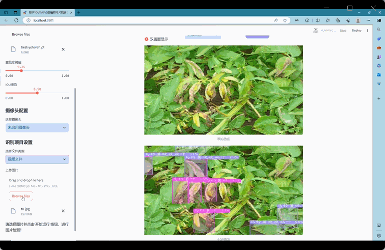 (3)选择视频文件检测:系统支持用户上传视频文件进行植物叶片病害识别。上传的视频将被系统逐帧分析,以识别和标记视频中每一帧的植物叶片病害。用户可以观看带有植物叶片病害识别标记的视频,了解视频中植物叶片病害的变化。