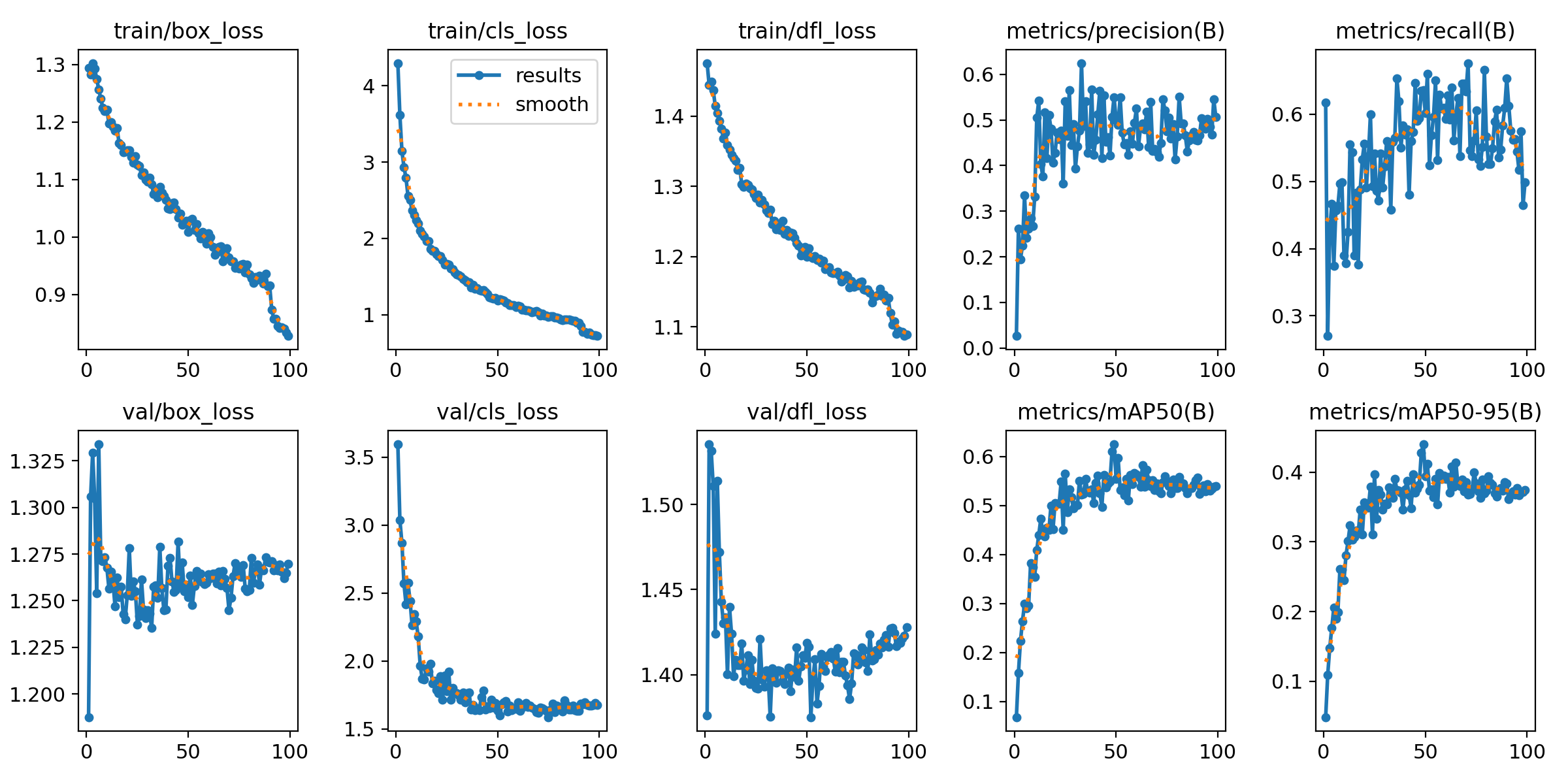mAP(mean Average Precision)是衡量模型性能的重要指标,尤其是mAP@0.5和mAP@0.5-0.95,它们分别代表在IoU阈值为0.5时的mAP和在IoU阈值从0.5到0.95的平均mAP。我们可以看到,随着训练的进行,mAP@0.5指标显示出稳定的提升,表明模型在较为宽松的IoU阈值下的性能提升是显著的。mAP@0.5-0.95指标虽然增长较为缓慢,但总体上也展现出正向的增长,这意味着模型在更加严格的评估标准下同样表现良好。