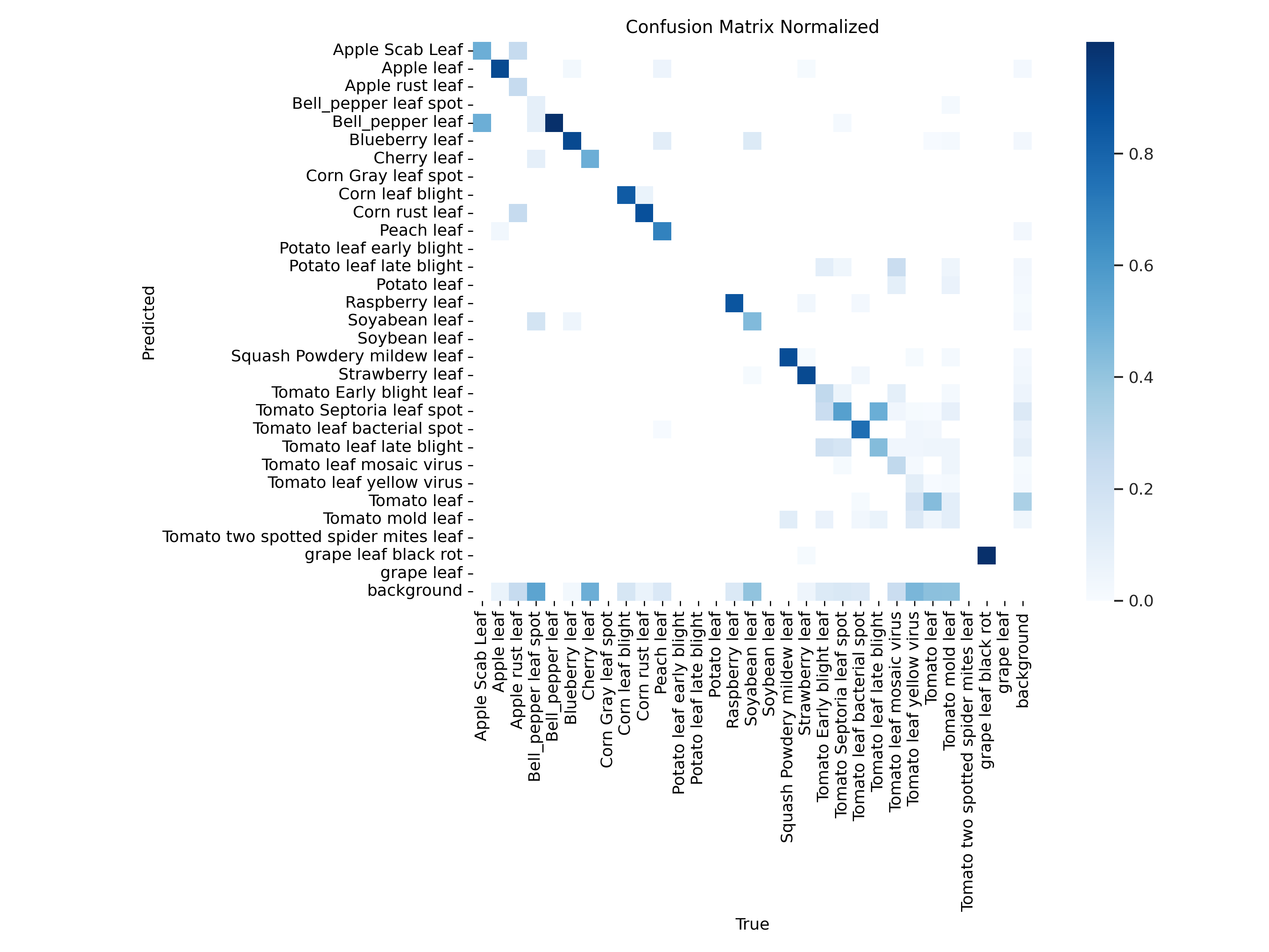 首先,观察混淆矩阵的主对角线,我们可以看到多数类别的预测准确率相对较高,这表明模型能够正确分类多数植物叶片的病害类型。对角线上的深色方块表示较高的归一化值,这是模型识别正确的表现。尤其是对于某些特定的类别,如Tomato yellow leaf virus和Bell pepper leaf spot,模型展现出了非常高的准确率。
