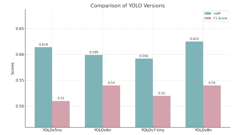 在F1-Score方面,YOLOv6n和YOLOv8n共同以0.54的得分位于首位。F1-Score是精确度和召回率的调和平均值,高得分表明模型在精确识别正类别的同时,也能最小化漏检。YOLOv8n之所以能够在这一指标上取得好成绩,可能是因为其更好的特征提取能力和更加精细的边界框回归机制,这些都是进行准确目标检测所必需的。