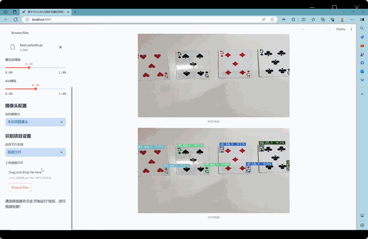 (3)选择视频文件识别:除了静态图片检测,系统还支持上传并分析视频文件。用户可以选择本地的视频文件,系统将逐帧分析视频内容,实时展示视频中扑克牌的检测结果。这一功能适合于视频内容分析,如分析扑克牌游戏过程中的动态变化。