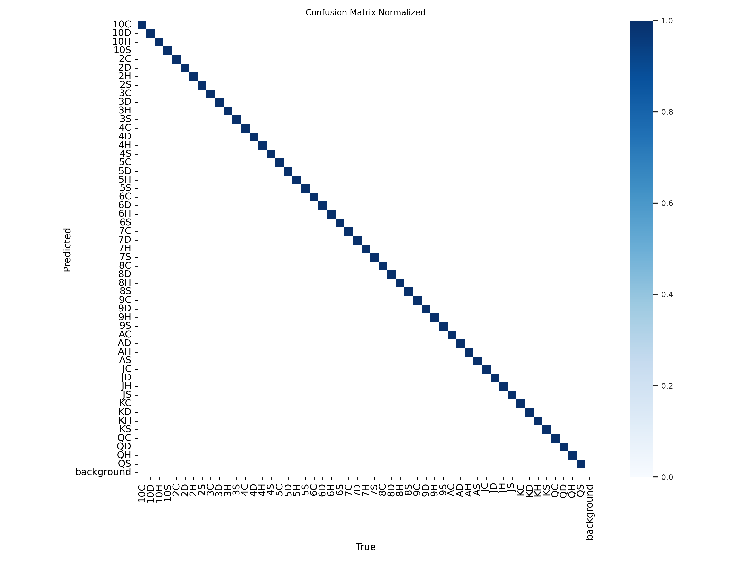 综上所述,从混淆矩阵中我们可以得出结论,该YOLOv8模型在多类别的扑克牌识别任务上具有高度的准确性和可靠性。它能够以高信度区分不同的扑克牌类别,表明了模型的鲁棒性和实际应用的可行性。不过,混淆矩阵中的具体数值会提供更多细节,可能会揭示出需要进一步优化的特定类别。在应用这个模型前,仔细分析这些数值并考虑对策,例如增加某些类别的训练样本或调整权重,将进一步提高系统的整体性能。