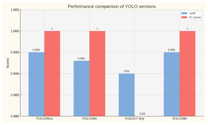 分析实验结果,我们可以看到YOLOv5nu和YOLOv8n在mAP上都取得了0.995的高分,而YOLOv6n紧随其后,分数为0.993。YOLOv7-tiny的mAP稍低,为0.990。在F1-Score上,YOLOv5nu、YOLOv6n和YOLOv8n都实现了完美的1.00得分,表明了这些模型在精确度和召回率上达到了最优平衡。相比之下,YOLOv7-tiny的F1-Score为0.98,略低于其他模型。