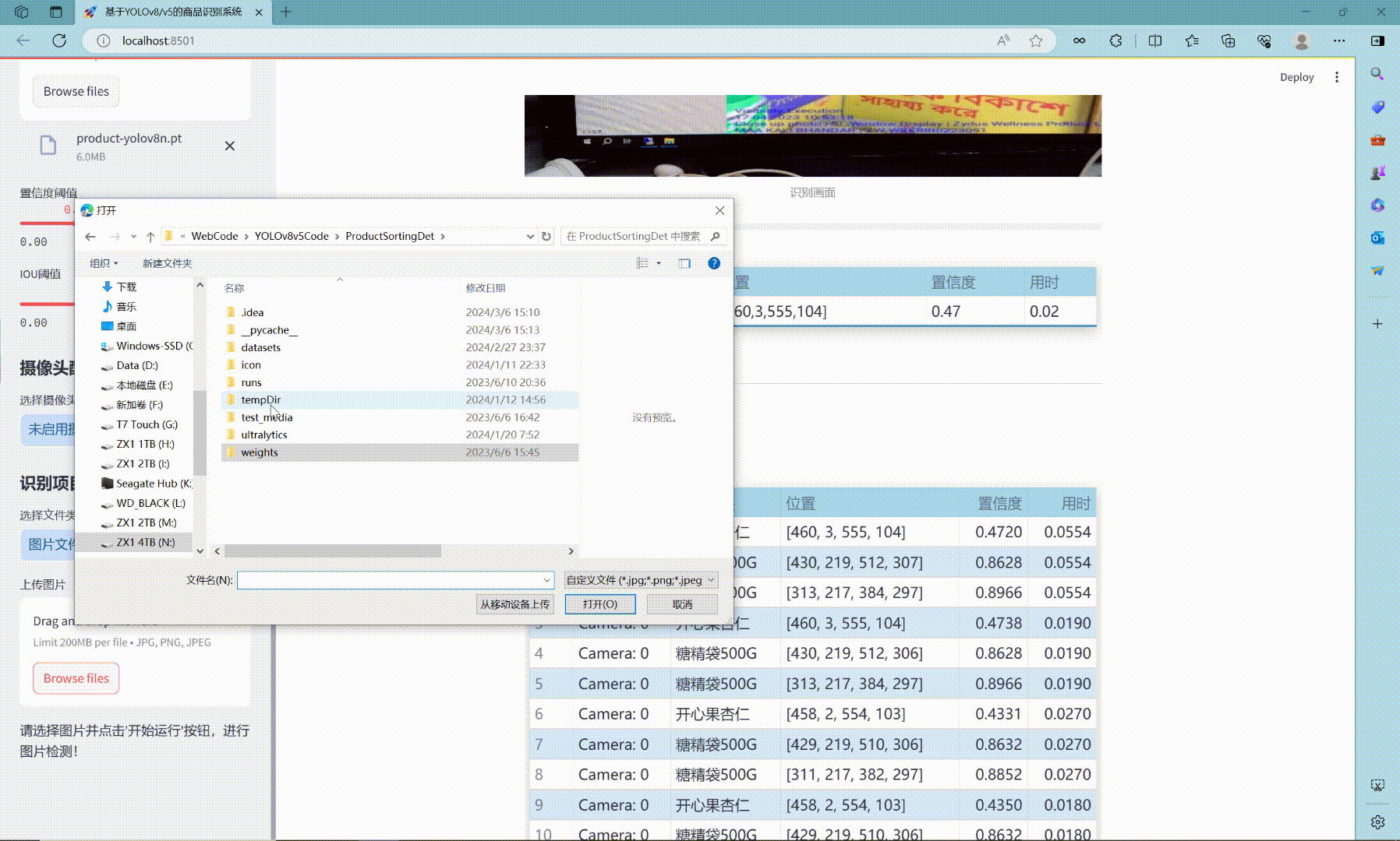 (2)选择图片检测:用户可以上传本地的图片文件到系统中进行商品识别。系统会分析上传的图片,识别出图片中的商品,并在界面上展示带有商品标签和置信度的检测结果,让用户能够清晰地了解到每个商品状态。