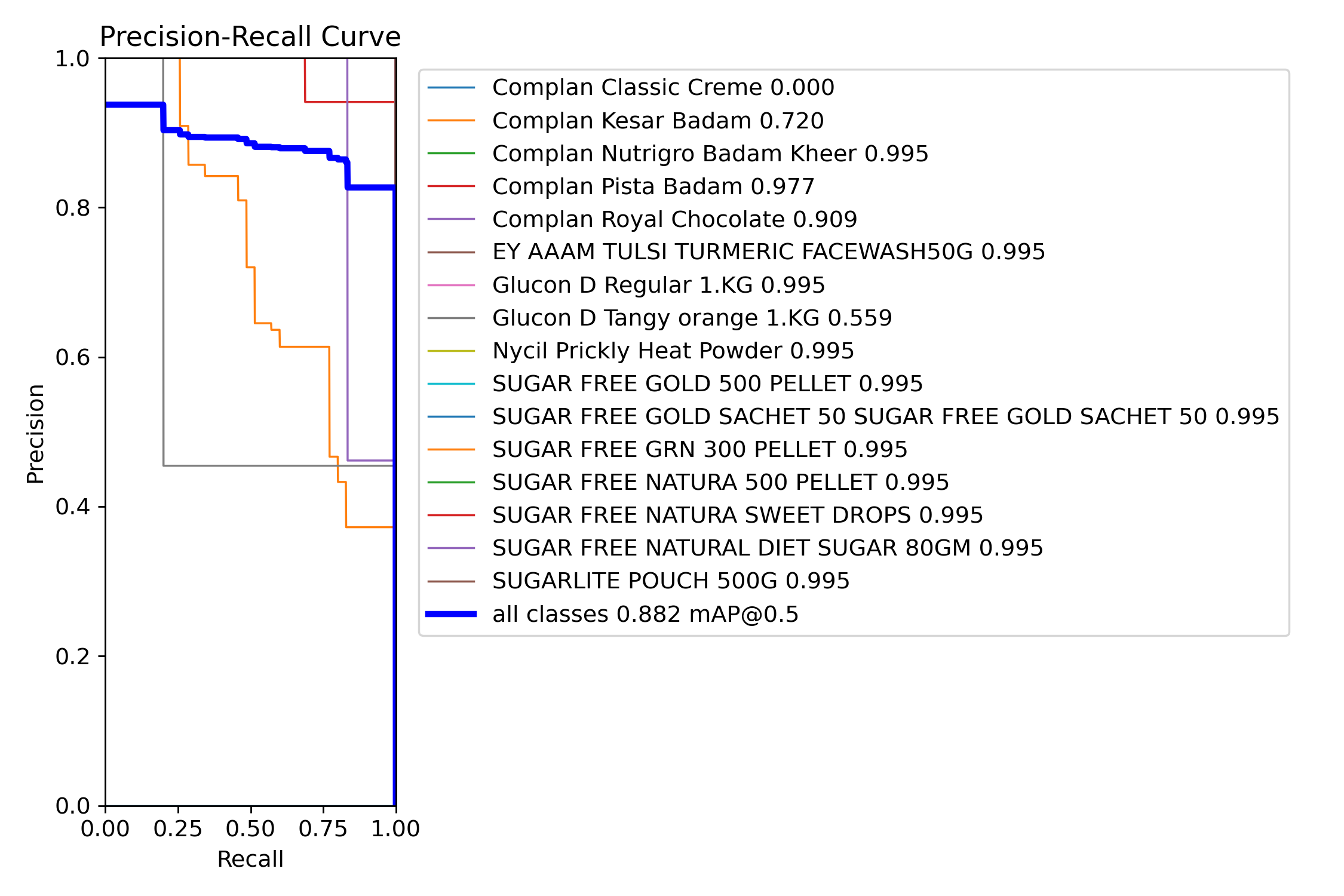从图中可以观察到,多数类别的PR曲线都显示出了较高的精确度和召回率,特别是像“Complan Nutrigro Badam Kheer”、“Nycil Prickly Heat Powder”和多个“SUGAR FREE”系列产品等,它们的精确度几乎达到了1.0,而召回率也非常高。这表明模型在这些类别上的表现极为出色,几乎能检测出所有的正样本,且几乎没有误检。