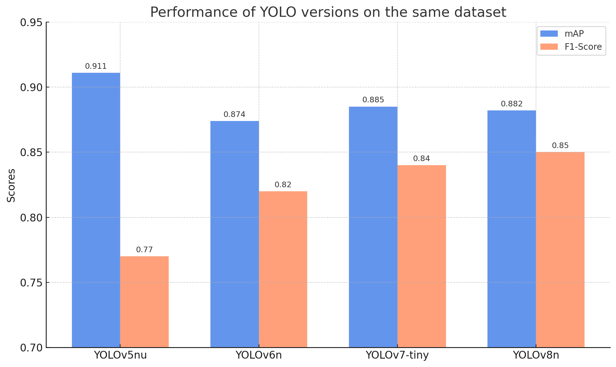 YOLOv6n和YOLOv7-tiny在两个指标上的表现较为接近,mAP分别为0.874和0.885,F1-Score分别为0.82和0.84。这表明这两个模型在平衡精确度和召回率方面做得比YOLOv5nu好。YOLOv7-tiny在F1-Score上的略高得分可能是由于其在处理小型目标或复杂场景时的优化改进。