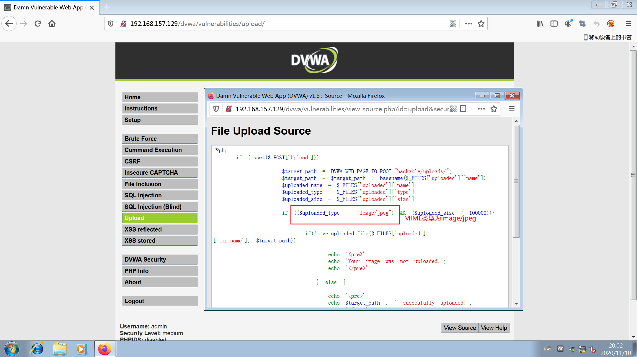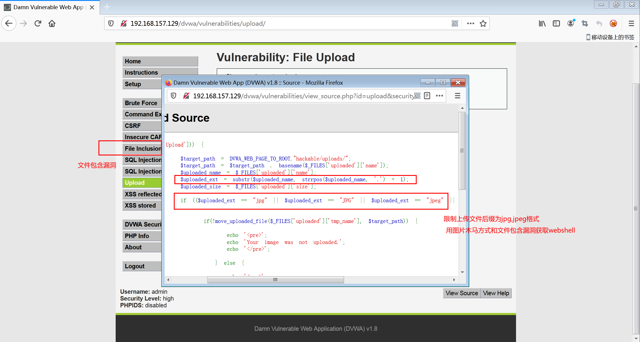 2.查看源代码,文件上传限制后缀是.jpg .jpeg格式,需要用到图片木马和文件包含漏洞实现