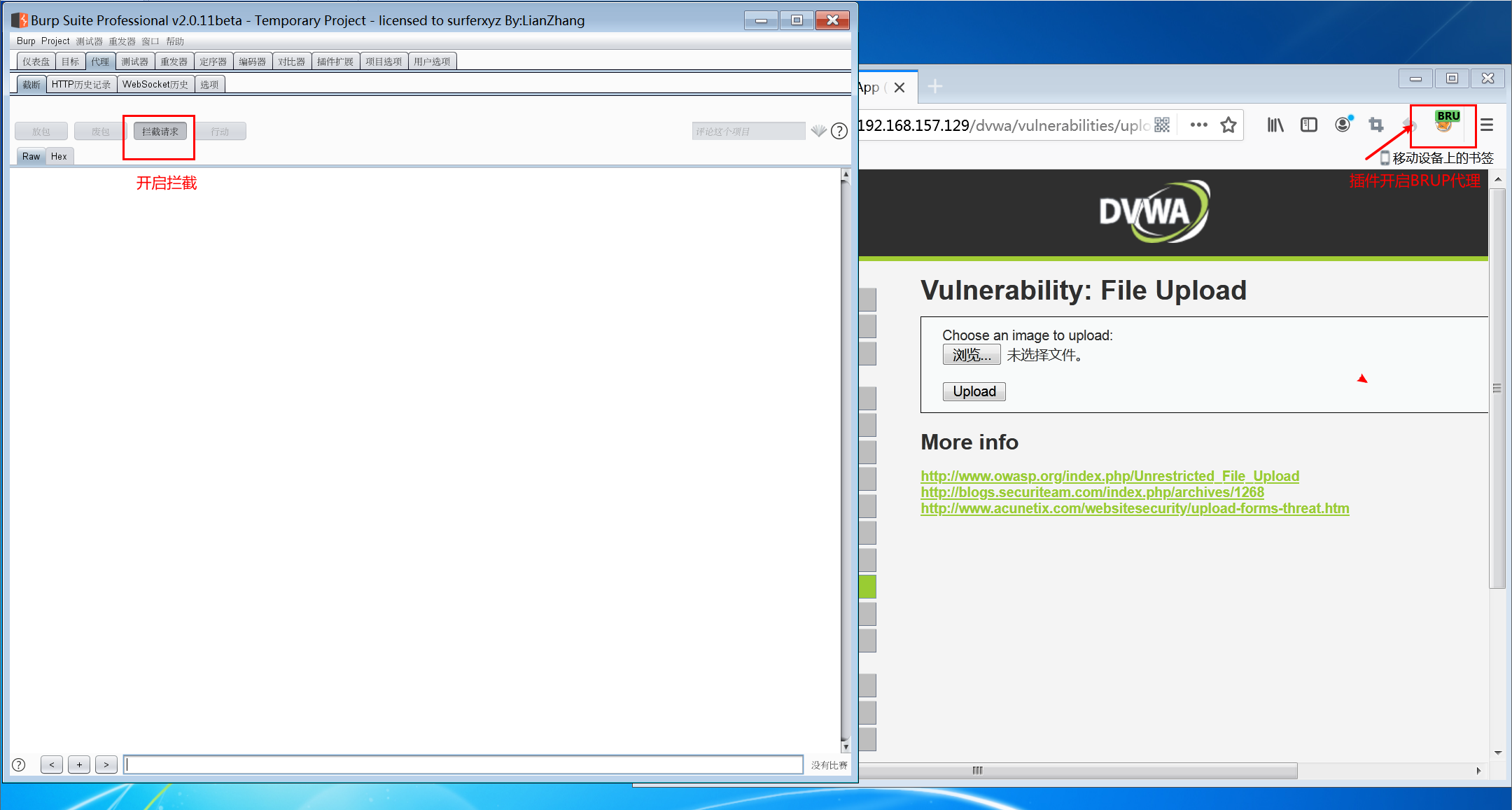 4.开启BRUP代理功能,我用的插件是foxy proxy插件,brup suite 开启拦截请求