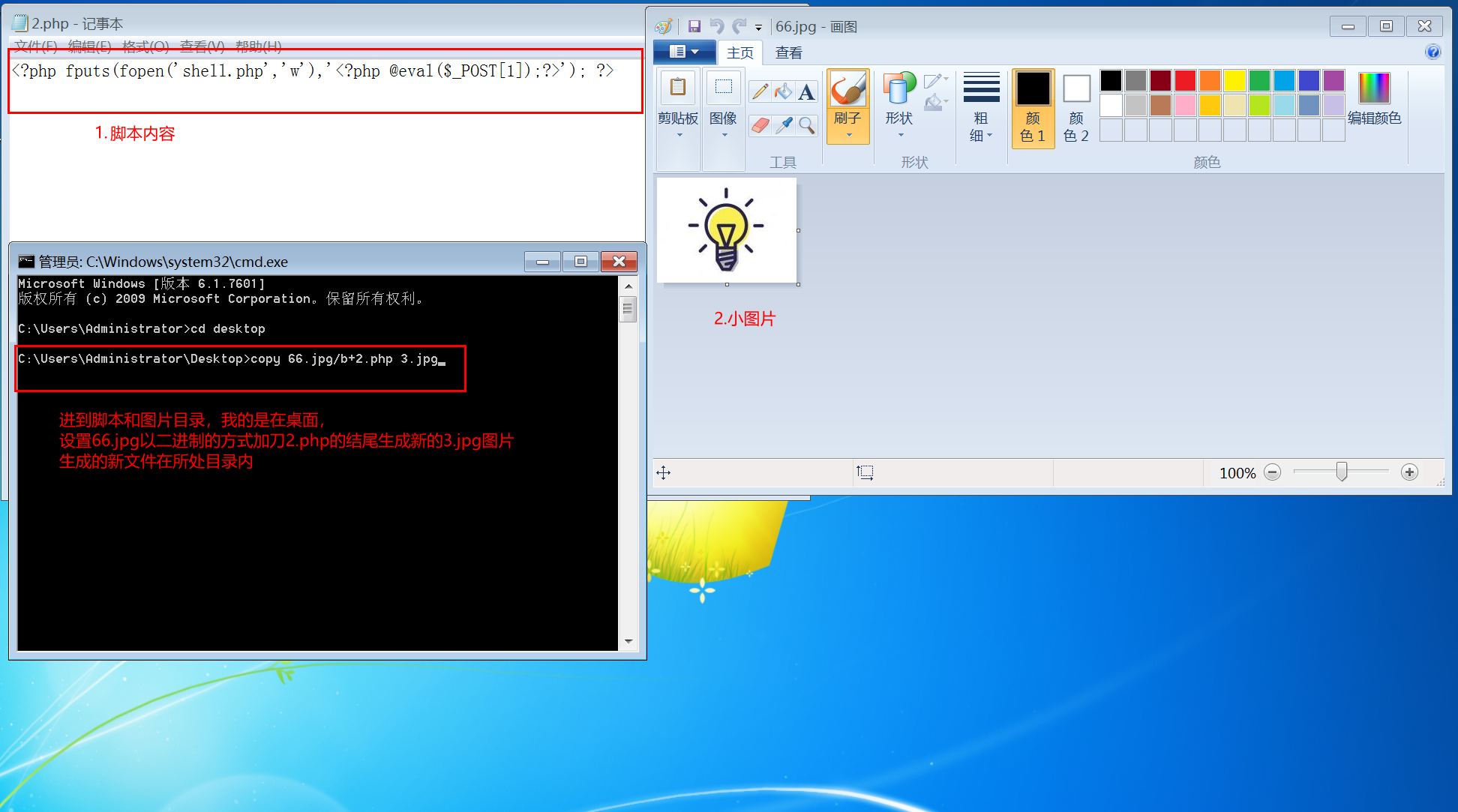 CMD命令:copy 66.jpg/b+2.php 3.jpg 格式:copy 空格 图片名称/b+脚本名称 空格 新的文件名称