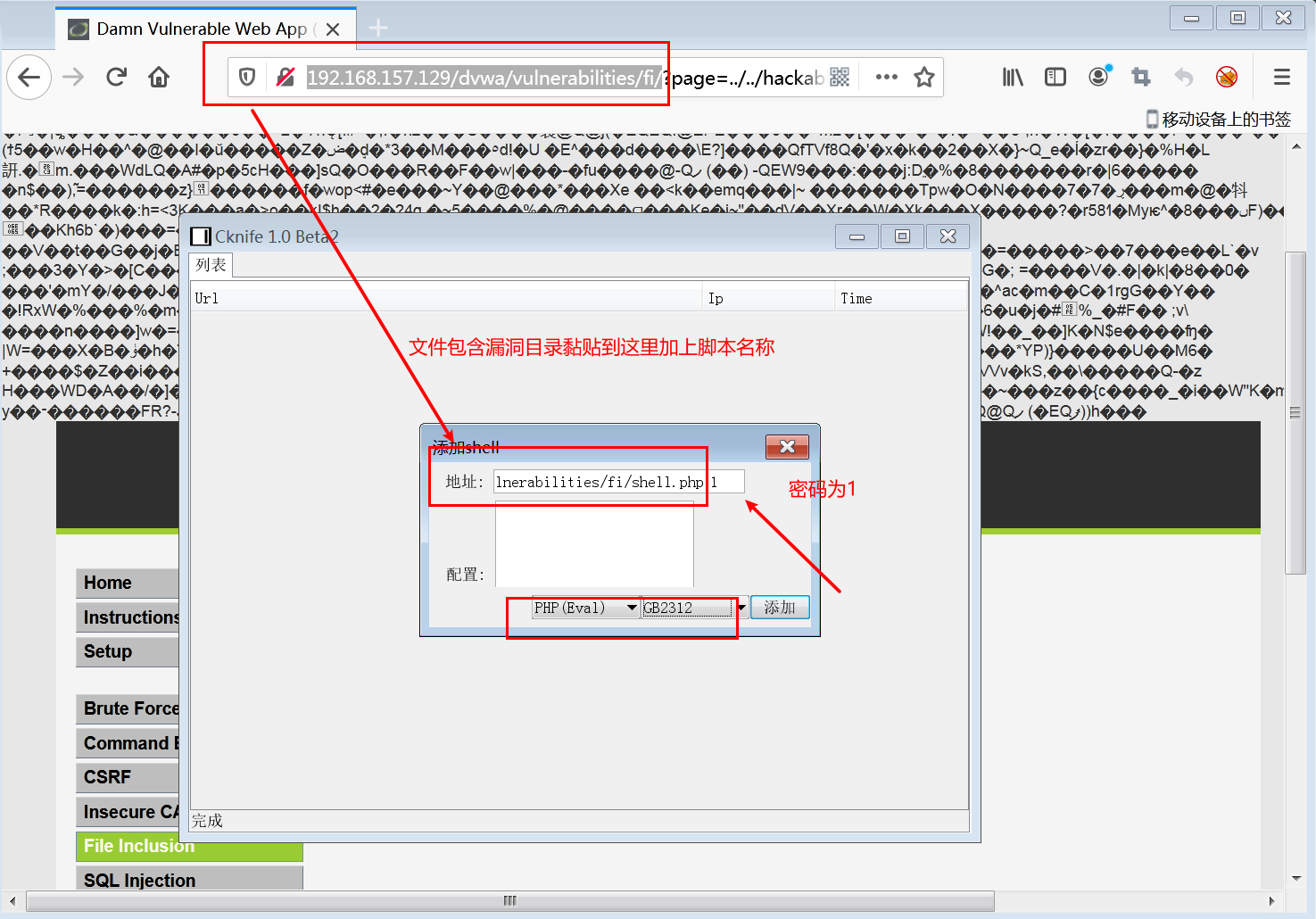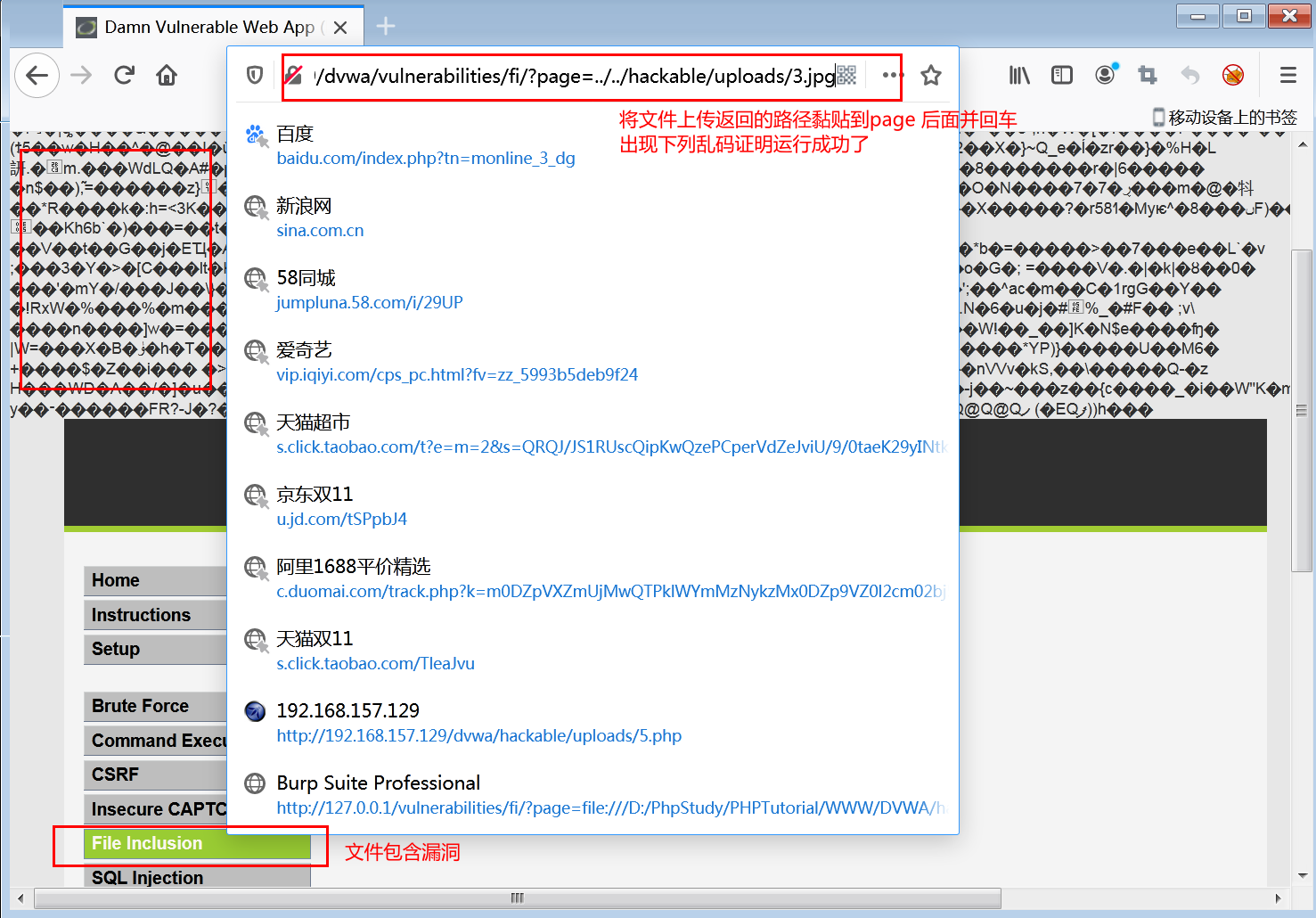 5.将上传图片返回的路径复制到文件包含漏洞(低级)URL地址栏page= 后面并回车返回乱码说明已经生成shell.php文件到fi目录下