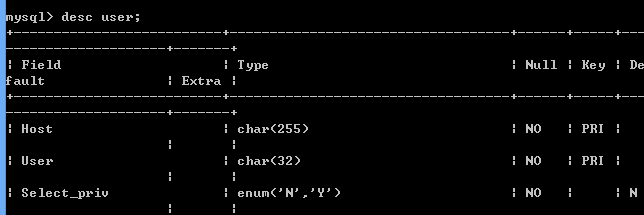 user 表的权限列包括 Select priv、Insert priv、Update priv 等以priv结尾的字段。这些字段决定了用户的权限,包括查询、修改、关闭等。其取值为N,表示有权限,Y表示没有权限。