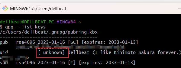 我重新回看了导入GPG公钥私钥的教程并重新执行了列出新设备上所有存在的公钥信息时,发现在自己的名称前有一个unknown的标识