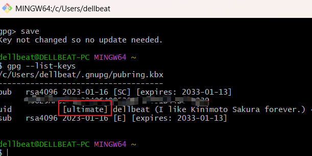 我通过搜索引擎搜索“GPG迁移”时,发现git支持导出指定的公钥私钥并导入到新的设备;于是我删除了原来复制的文件夹并按照教程执行了GPG迁移操作