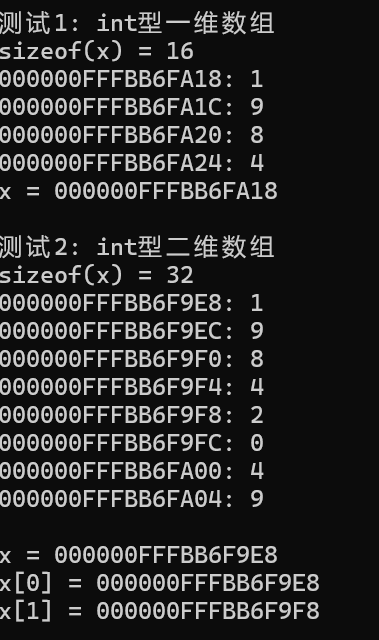 1 #include <stdio.h> 2 #define N 4 3 #define M 2 4 5 void test1() { 6 int x[N] = { 1, 9, 8, 4 }; 7 int i; 8 9 // 输出数组x占用的内存字节数 10 printf("sizeof(x) = %d\n", sizeof(x)); 11 12 // 输出每个元素的地址、值 13 for (i = 0; i < N; ++i) 14 printf("%p: %d\n", &x[i], x[i]); 15 16 // 输出数组名x对应的值 17 printf("x = %p\n", x); 18 } 19 20 void test2() { 21 int x[M][N] = { {1, 9, 8, 4}, {2, 0, 4, 9} }; 22 int i, j; 23 24 // 输出二维数组x占用的内存字节数 25 printf("sizeof(x) = %d\n", sizeof(x)); 26 27 // 输出每个元素的地址、值 28 for (i = 0; i < M; ++i) 29 for (j = 0; j < N; ++j) 30 printf("%p: %d\n", &x[i][j], x[i][j]); 31 printf("\n"); 32 33 // 输出二维数组名x, 以及,x[0], x[1]的值 34 printf("x = %p\n", x); 35 printf("x[0] = %p\n", x[0]); 36 printf("x[1] = %p\n", x[1]); 37 printf("\n"); 38 } 39 40 int main() { 41 printf("测试1: int型一维数组\n"); 42 test1(); 43 44 printf("\n测试2: int型二维数组\n"); 45 test2(); 46 47 return 0; 48 }