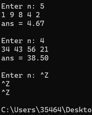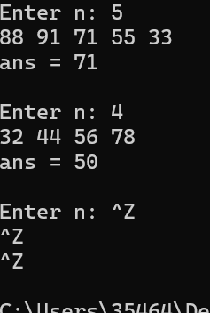 1 #include <stdio.h> 2 #define N 100 3 4 // 函数声明 5 // 待补足 6 // xxx 7 void input(int x[], int n); 8 double median(int x[], int n); 9 10 int main() { 11 int x[N]; 12 int n; 13 double ans; 14 15 while (printf("Enter n: "), scanf("%d", &n) != EOF) { 16 input(x, n); 17 ans = median(x, n); 18 printf("ans = %g\n\n", ans); 19 } 20 21 return 0; 22 } 23 24 // 函数定义 25 // 待补足 26 // xxx 27 void input(int x[], int n) { 28 for (int i = 0;i < n;++i) 29 scanf("%d", &x[i]); 30 } 31 double median(int x[], int n) { 32 for (int i = 0;i < n - 1;++i) { 33 for (int j = 0;j < n - i - 1;++j) { 34 if (x[j] > x[j + 1]) { 35 int y = x[j]; 36 x[j] = x[j + 1]; 37 x[j + 1] = y; 38 } 39 } 40 } 41 if (n % 2 == 1) 42 return x[n / 2]; 43 else 44 return(x[n / 2 - 1] + x[n / 2]) / 2; 45 }